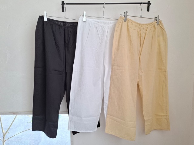 quality :cotton 100% color :blue white black size :free (ウエスト(ゴム )64~82 ㎝ 股上42 ㎝ 股下 39㎝ ヒップ 120 ㎝ わたり幅 39㎝ 裾幅 26 ㎝) 洗いざらしの様な自然な風合いが心地よく、 サラリとした肌触りです。ウエストにはギャザー、 切替え部分にはタックが施され、ふんわりとした 絶妙なシルエットを作ってくれています。 軽やかな穿き心地ですので、ワンピースの インナーパンツとしてもオススメです。 ポケット付きなのも嬉しいポイントです。 *水温30℃を限度に非常に弱く 洗濯機洗いOK です* (着画モデル身長151㎝)