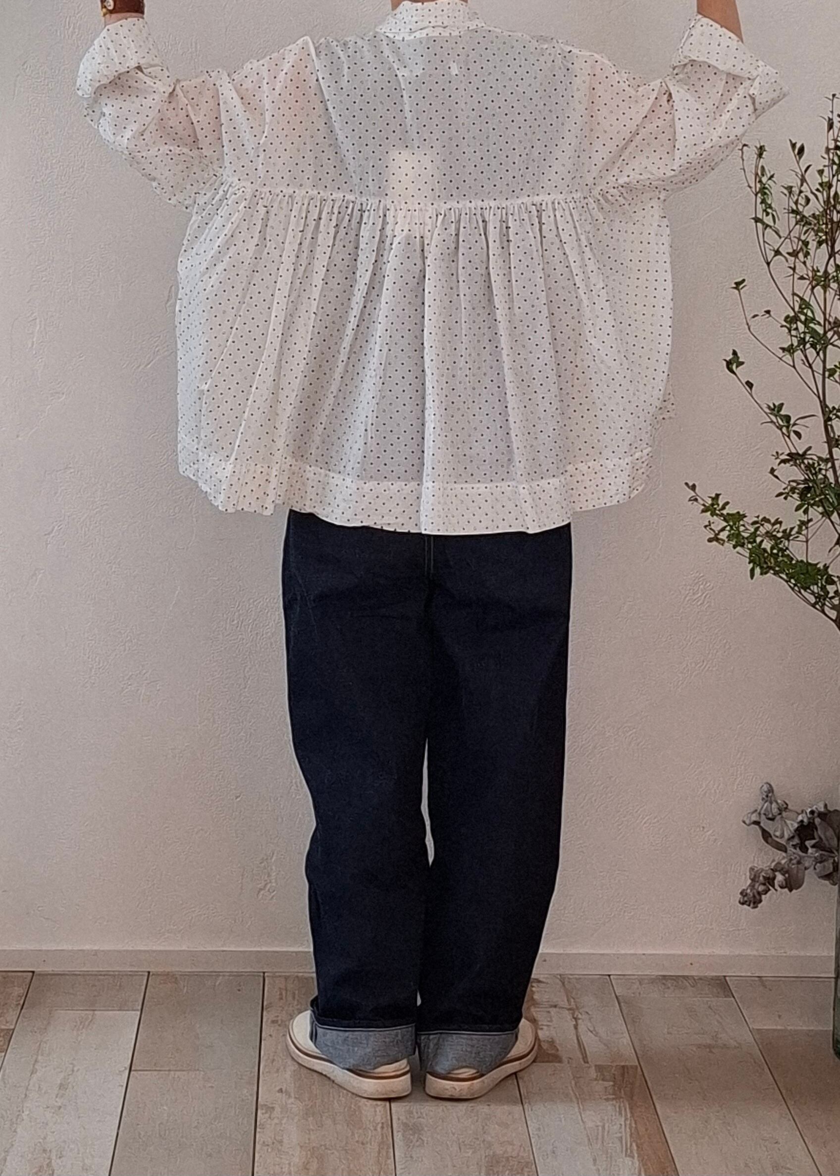 前身頃がシャツスリーブ、後ろがギャザーの入ったヨークスリーブになっており