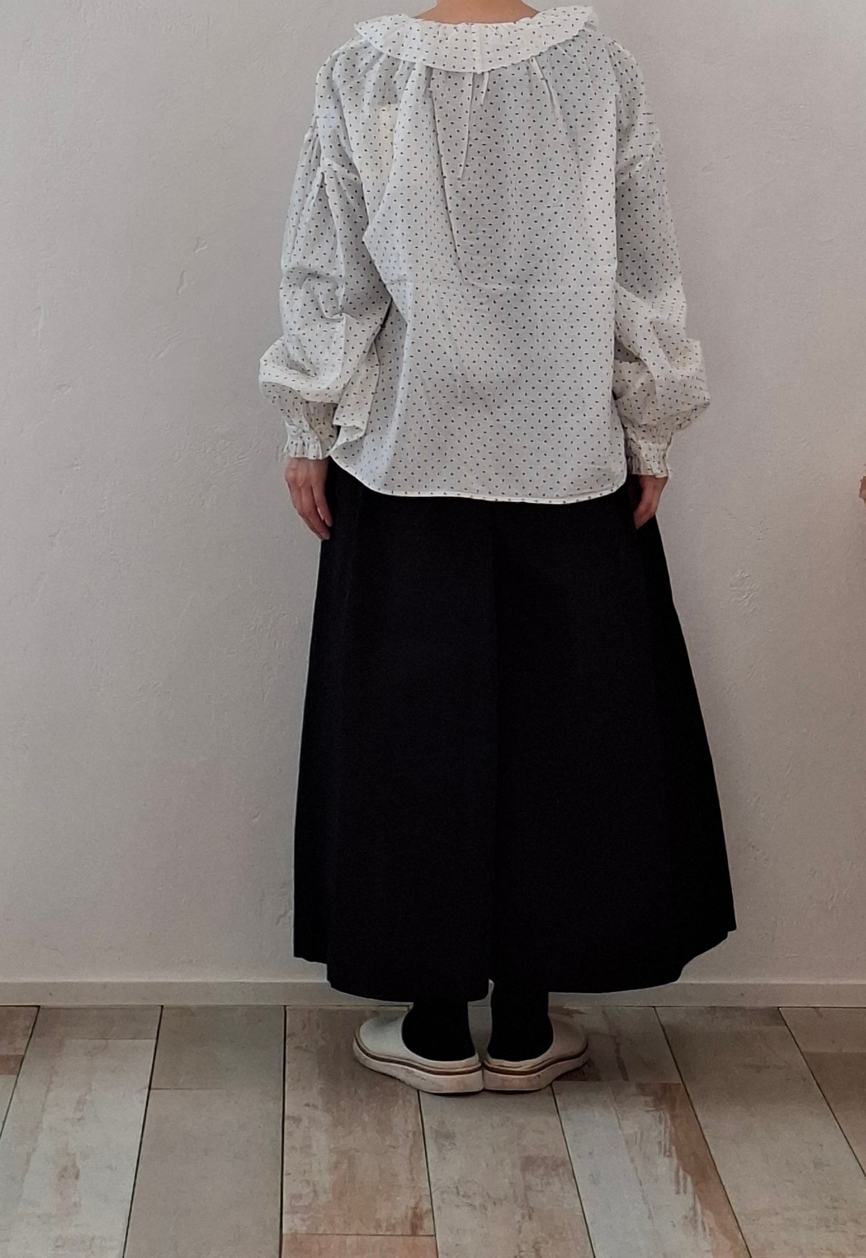 衿ぐりや袖口にギャザーを寄せ、裾に向かって広がる