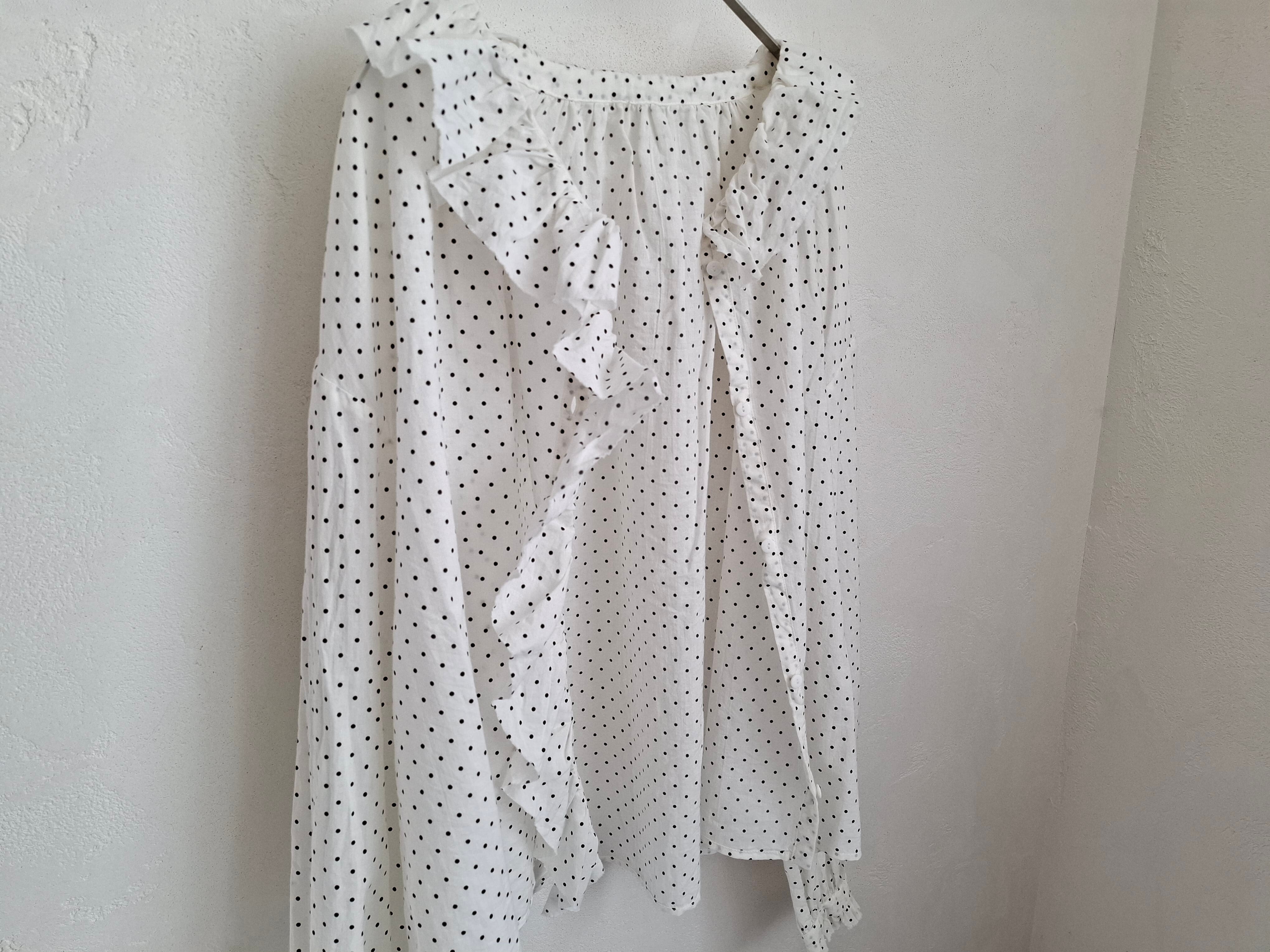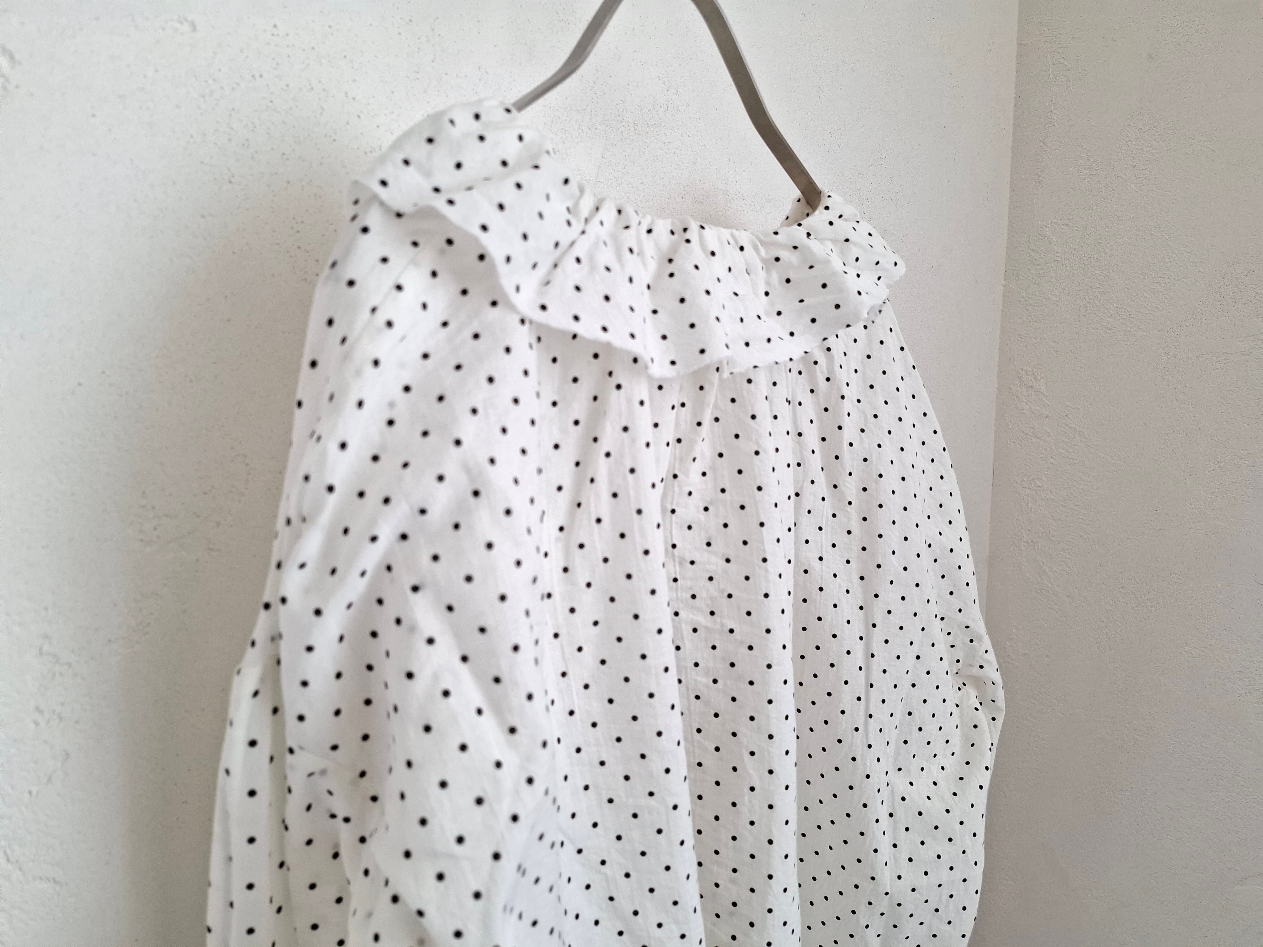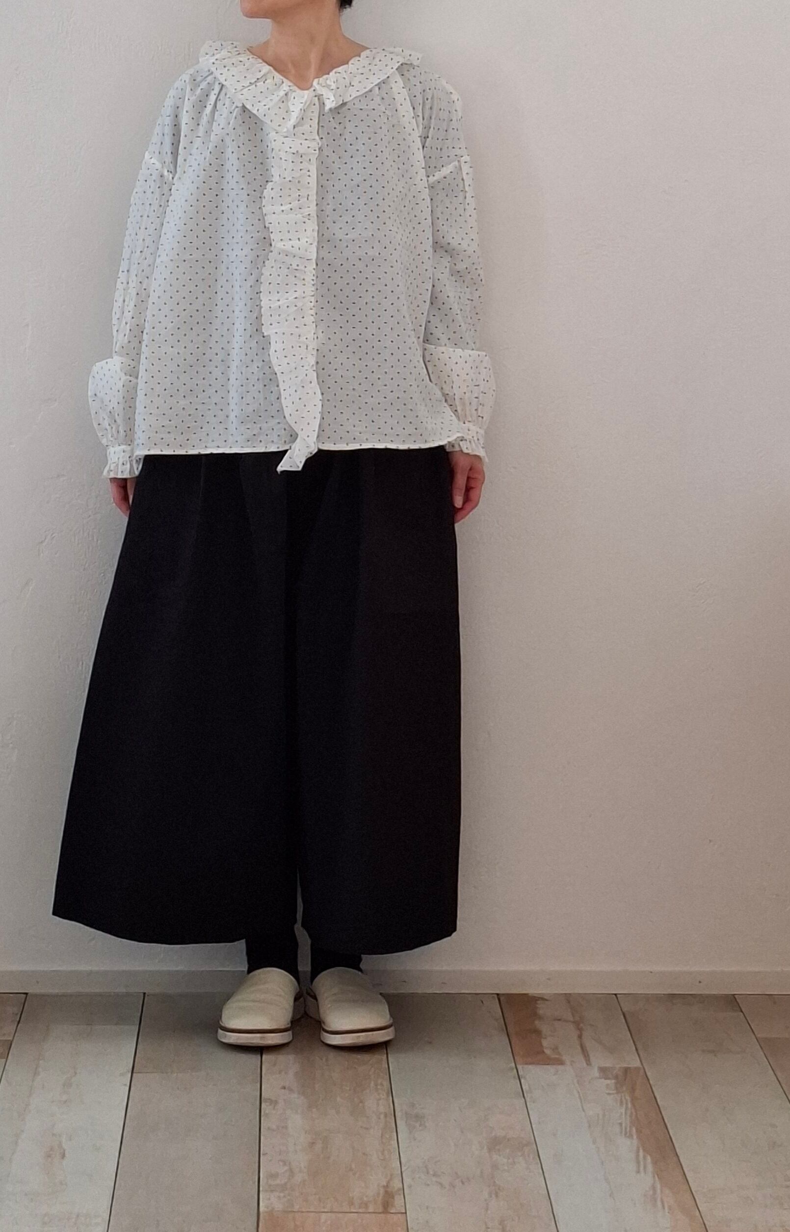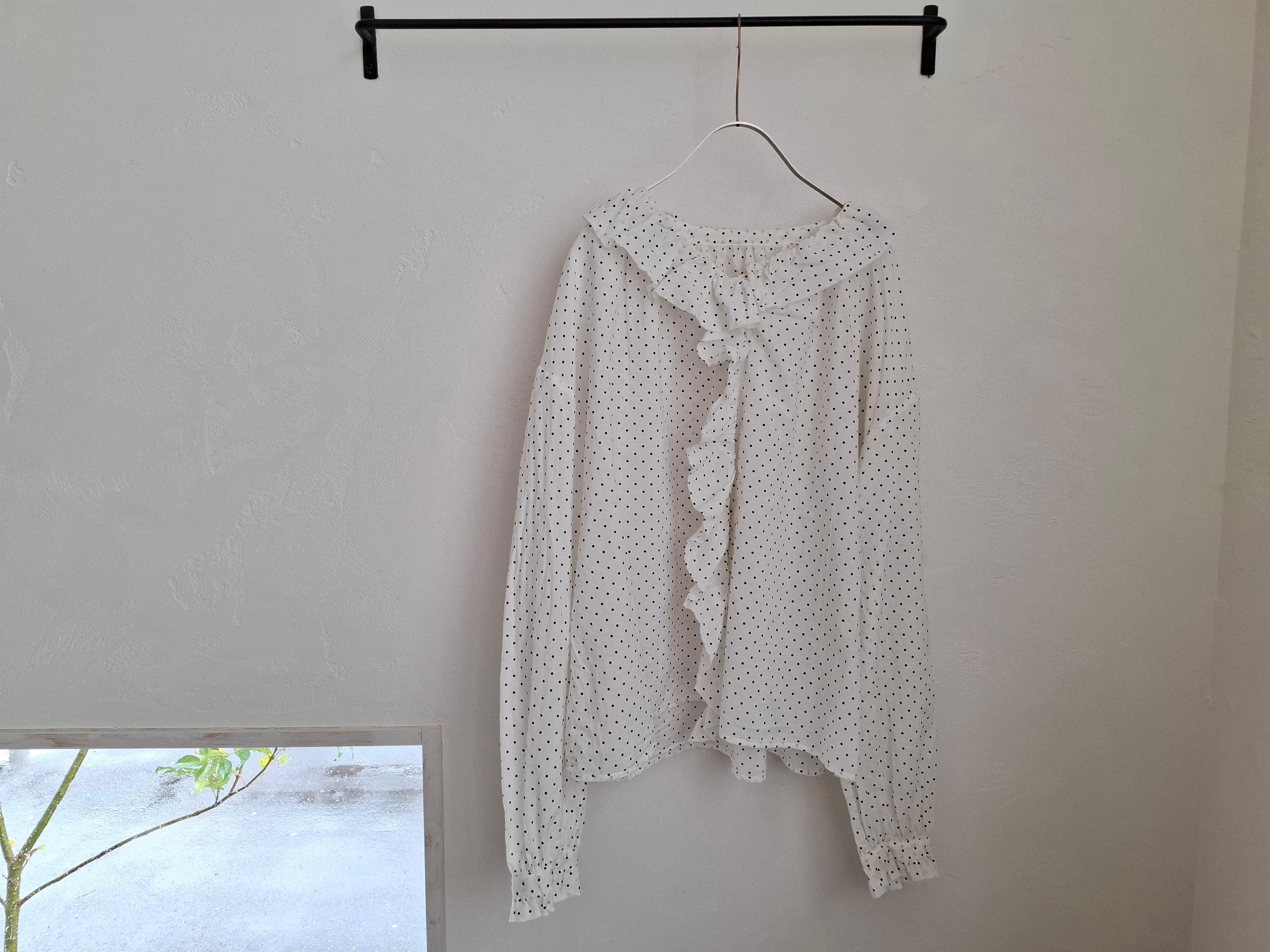 衿ぐりから前端に掛けて寄せられたフリルが特徴的な デザイン。