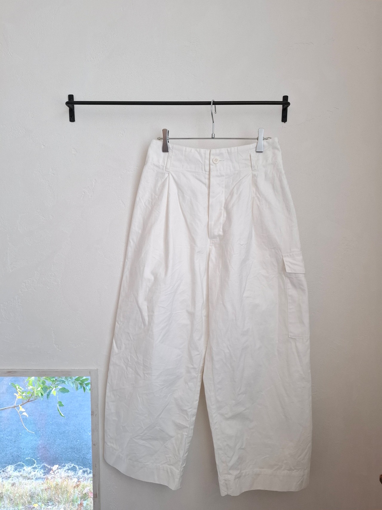 コットンのバックサテン素材でのストレートシルエットのパンツ。