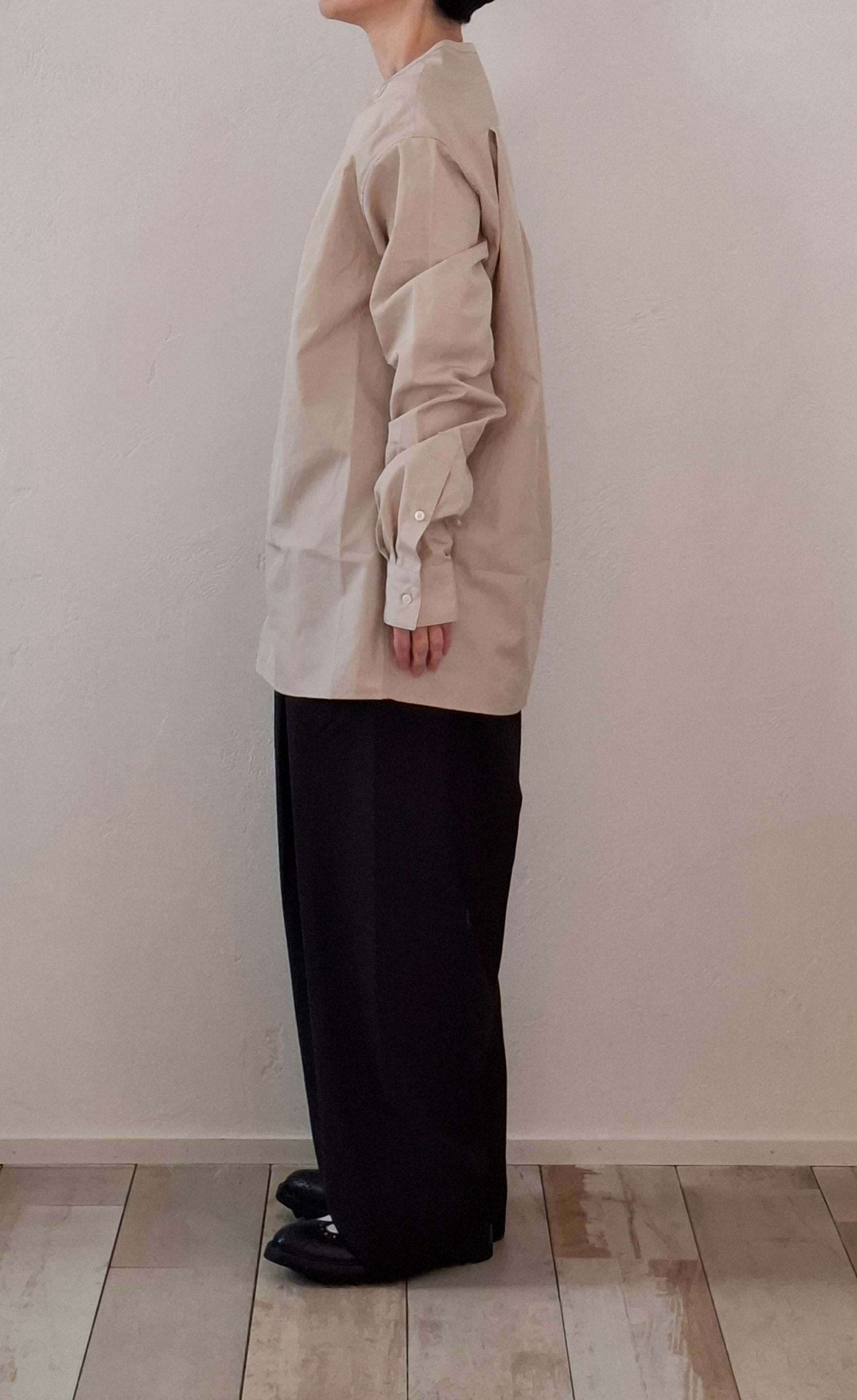 すっきりとした華奢なスタンドカラーとウエストを緩やかに