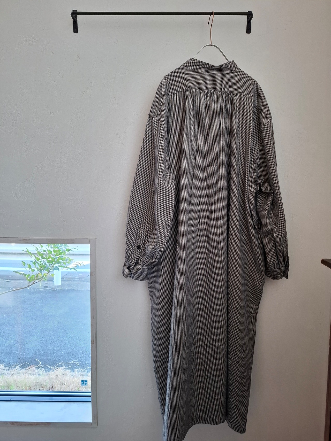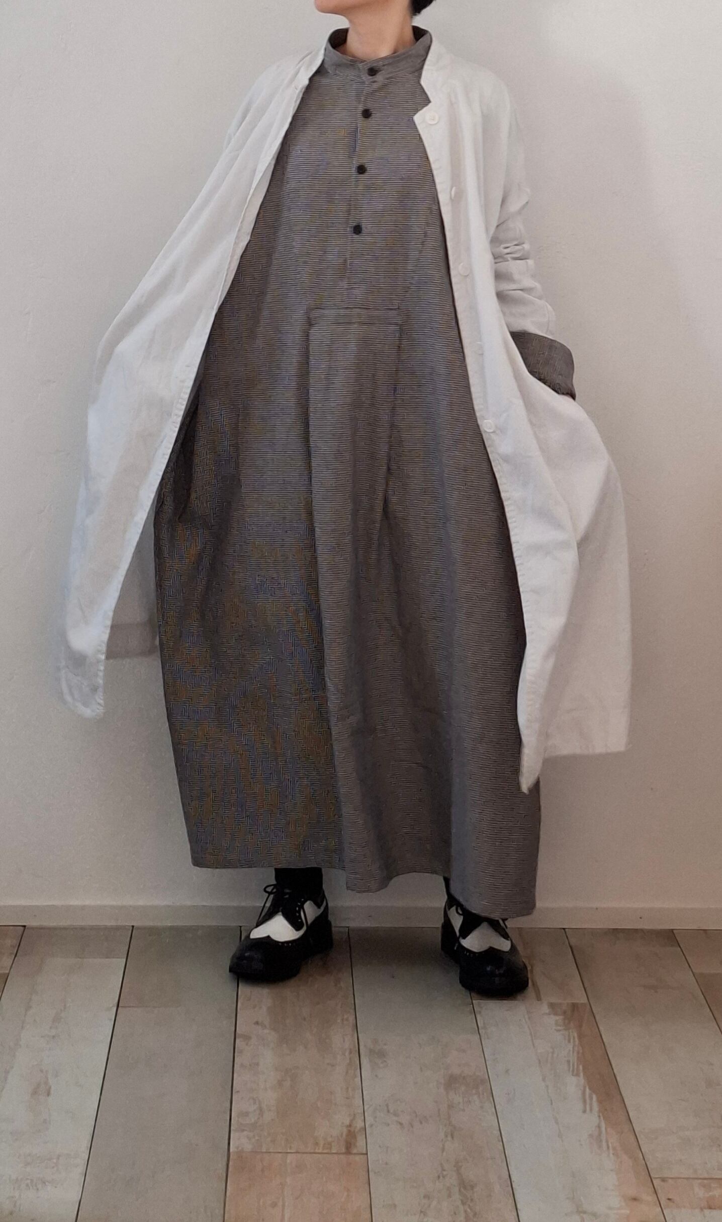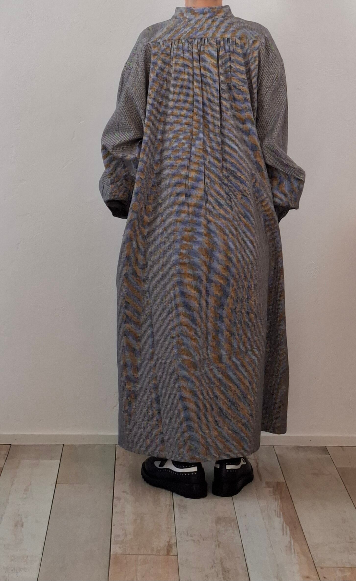 フロントの胸当てや狭く設定された後ろのヨーク切り替えが、ヴィンテージのドレスシャツを彷彿とさせるワンピース。身巾や袖巾にゆとりを持たせ、デイリーに着用しやすいバランスに仕上がっています。