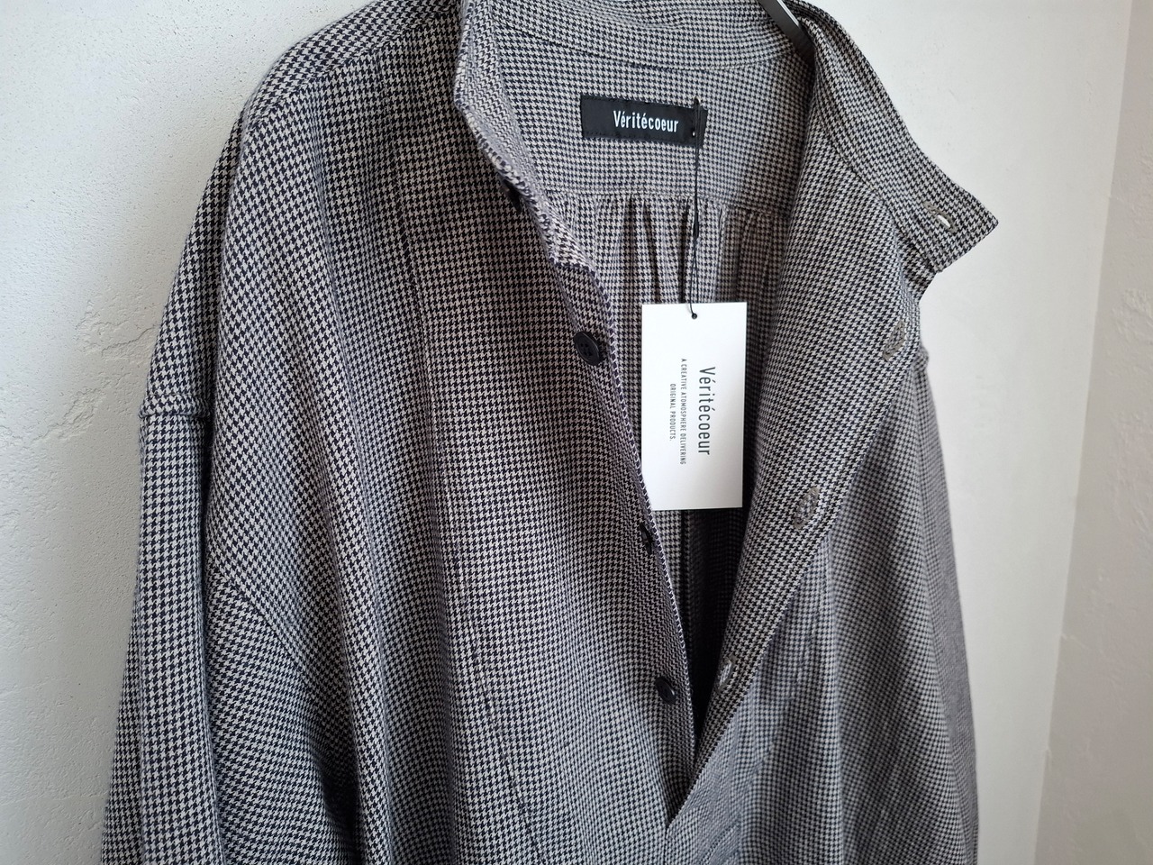 コットンリネンらしいナチュラルな風合いに千鳥柄の細かい表情が加わり、カジュアルな中にも品のある雰囲気に仕上がっています。ワッシャー仕上げにより、ふくらみと柔らかさを出しつつリネン特有のドライなタッチも残しています。