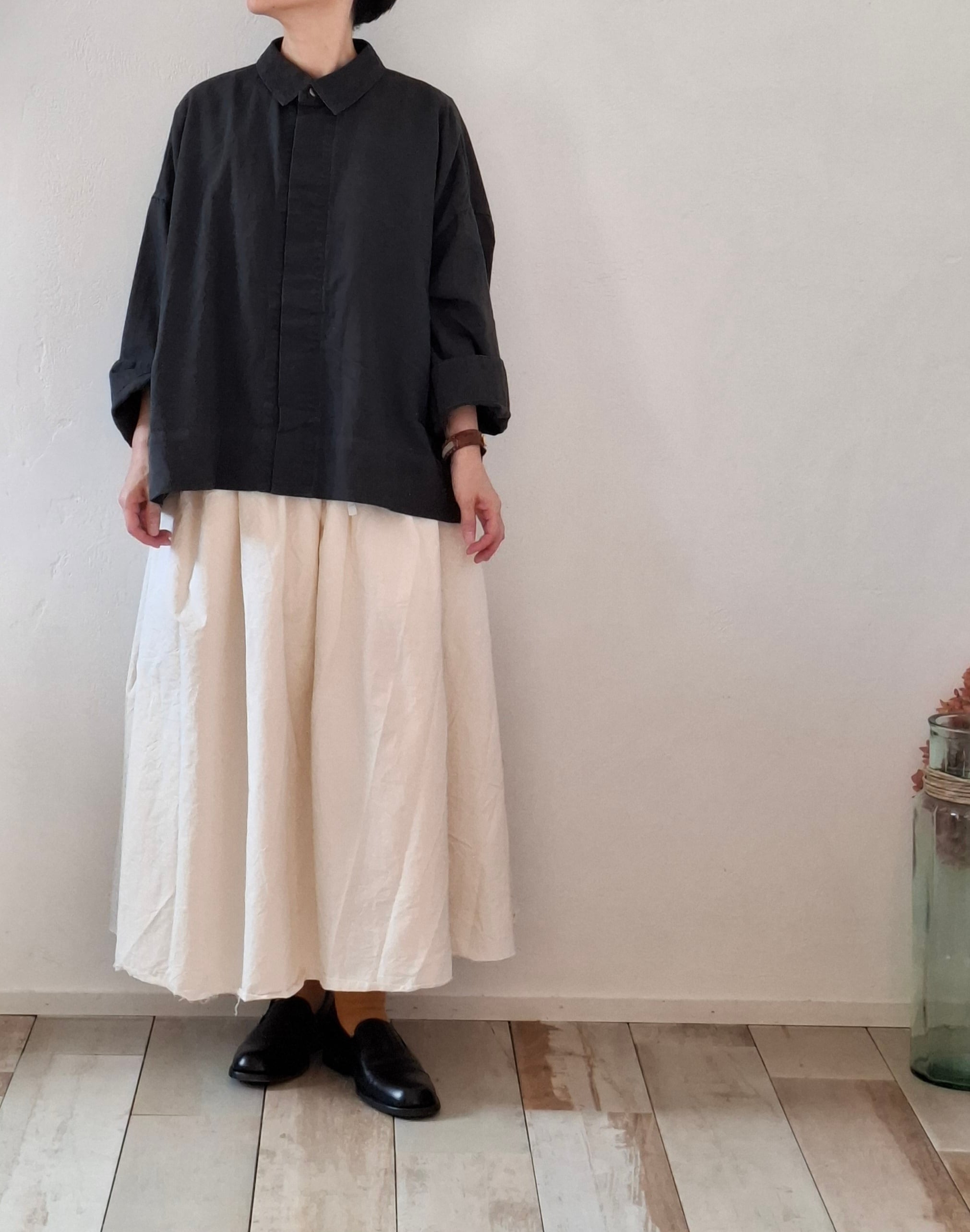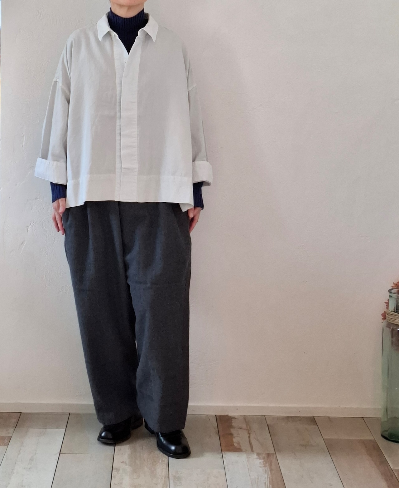 前開きは裾のみ閉じたプルオーバーデザイン。