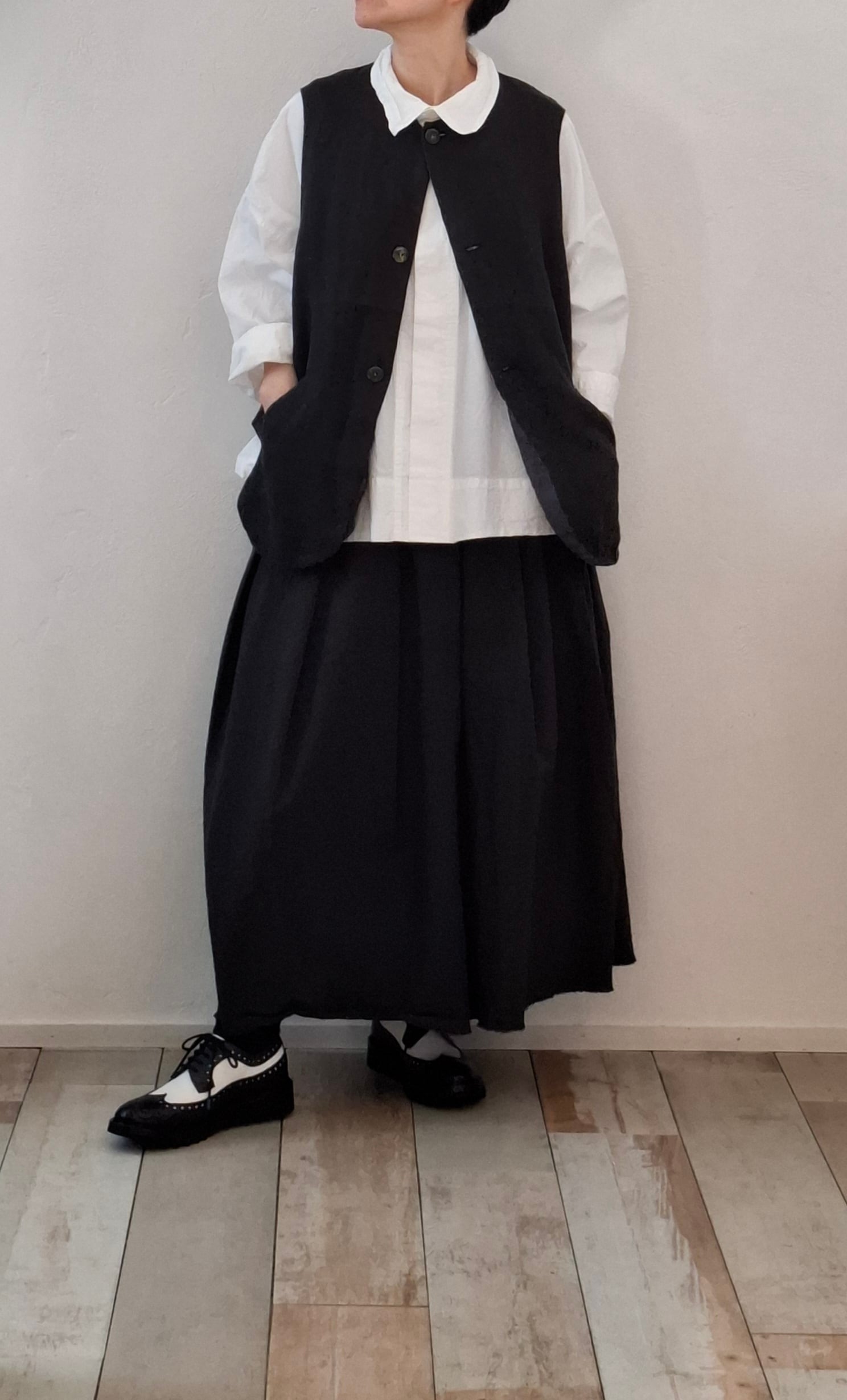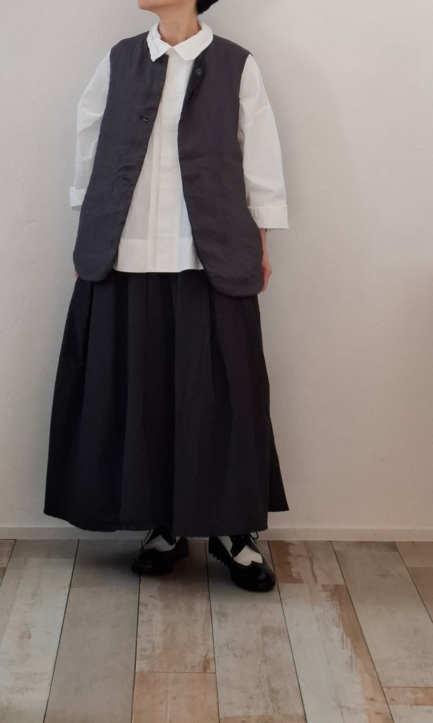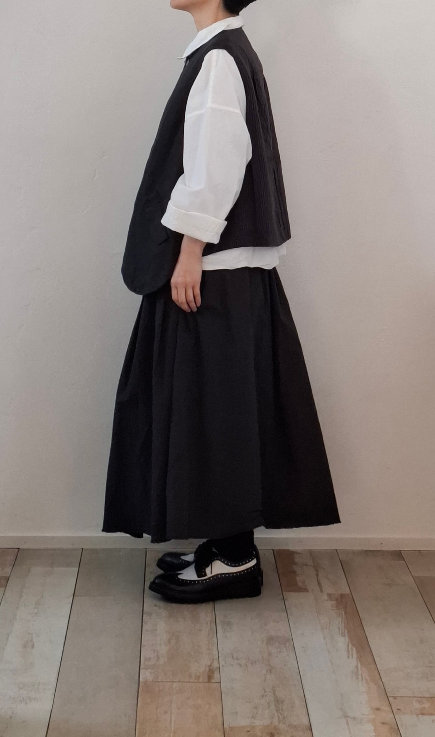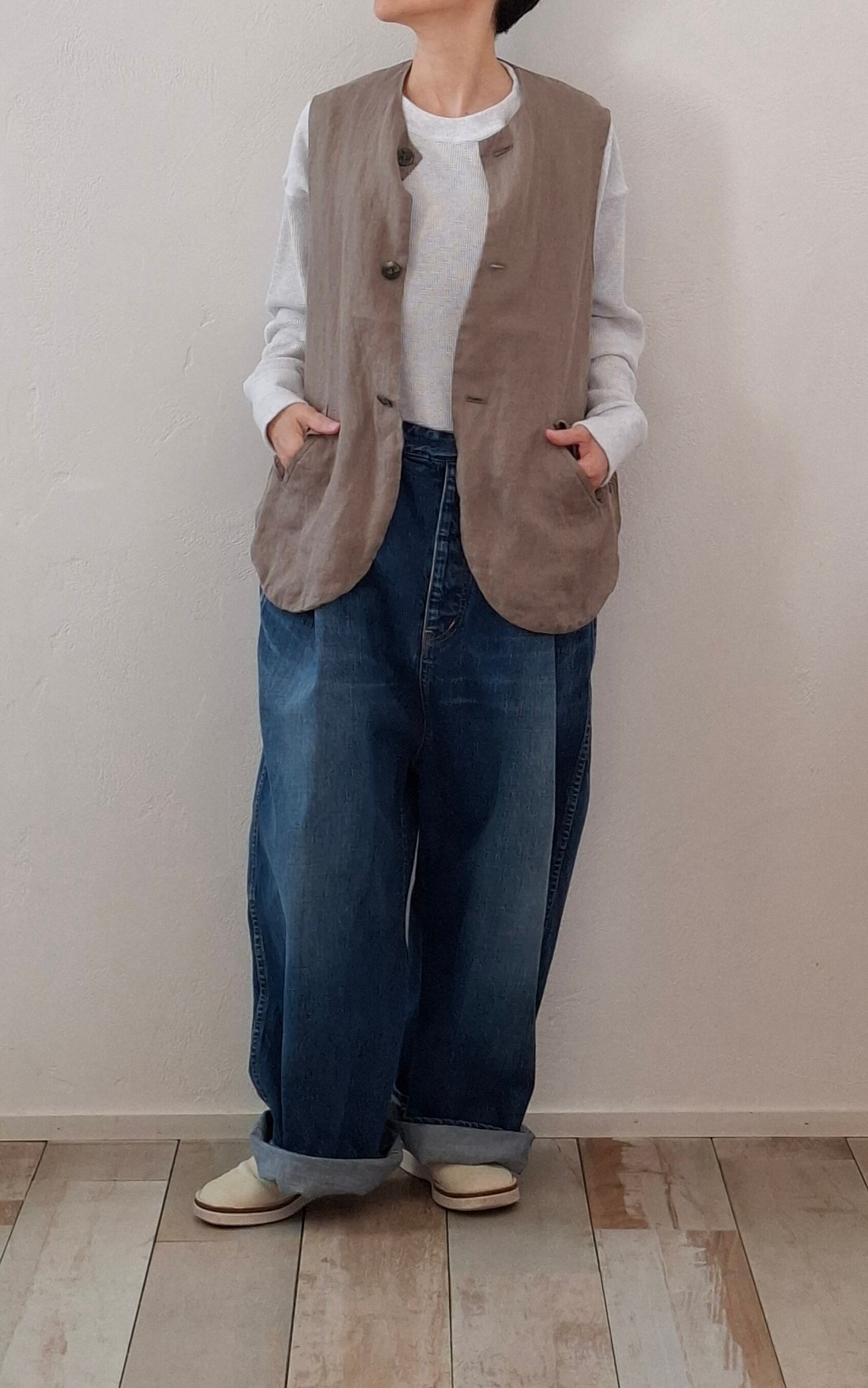 コンパクトな着丈に対し、身巾と袖ぐりをゆったりと取っておりインナーを選ばずに着用することができます。コーディネートのプラスアイテムとしておすすめの 1 着。