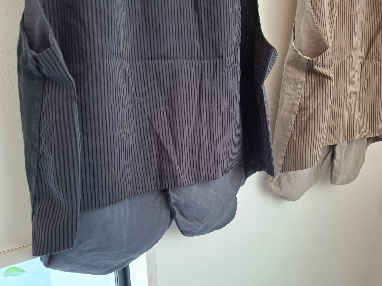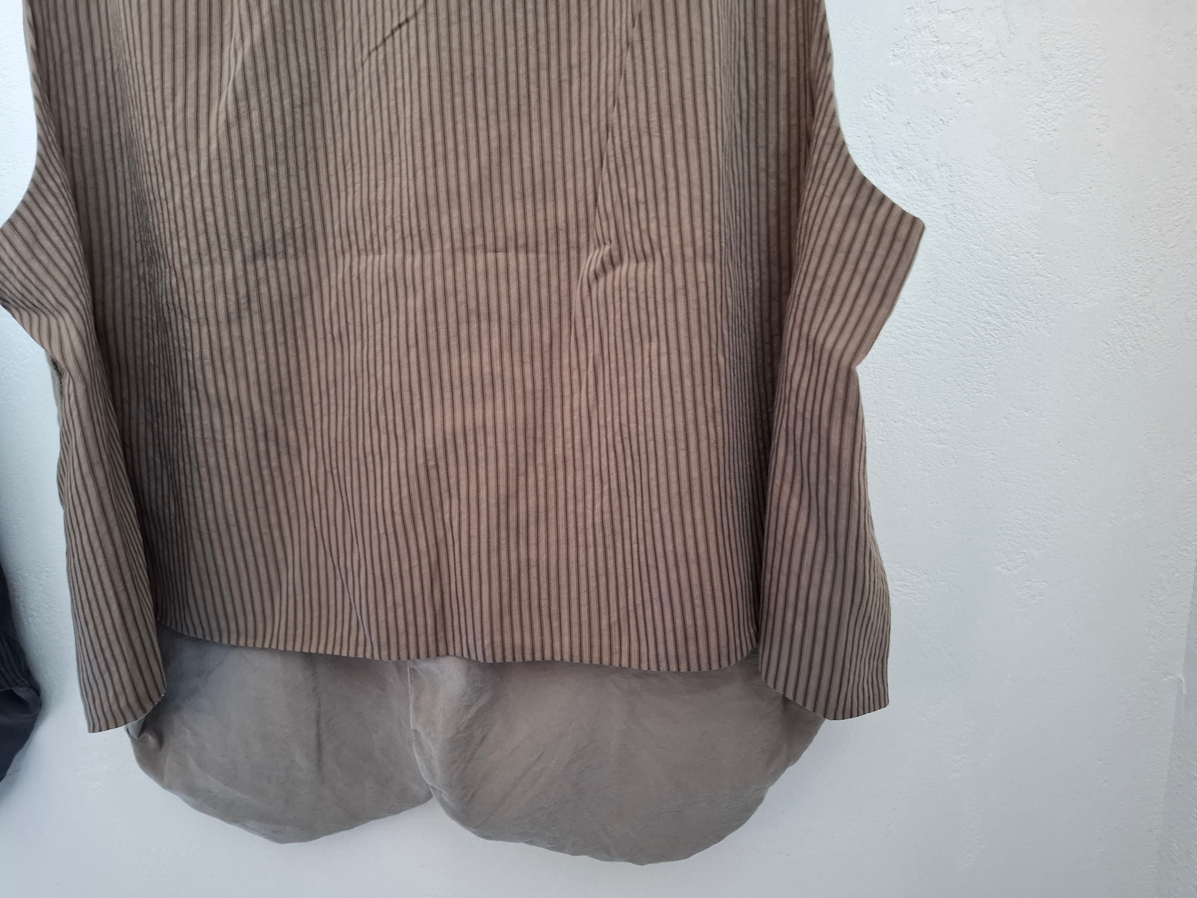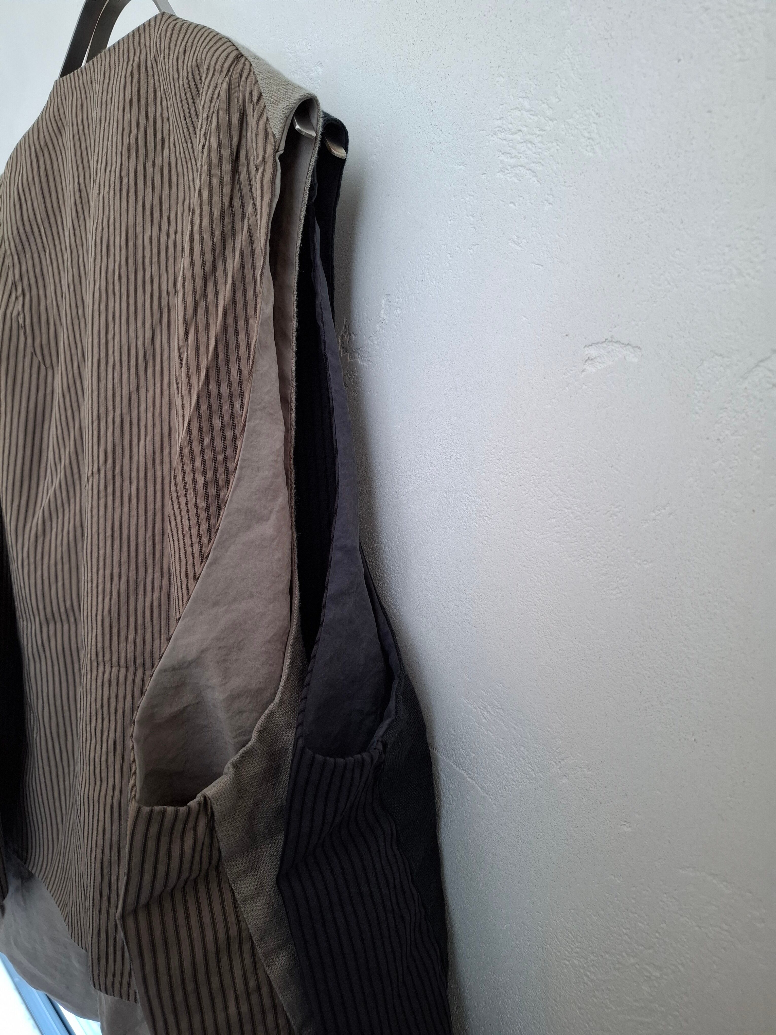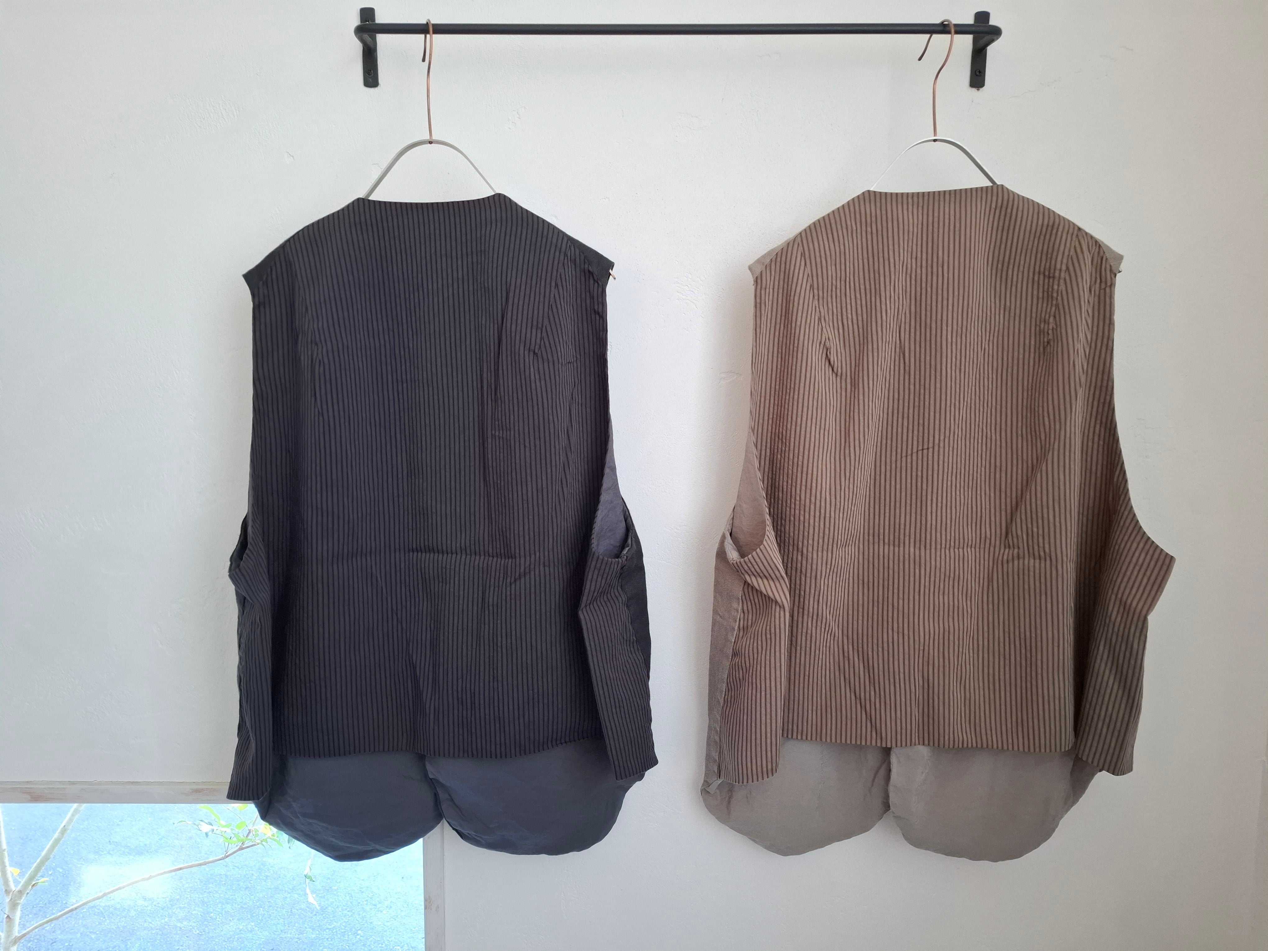 後ろ身頃ストライプ柄の生地を使用。裏地はとろみのある無地素材を用い、
