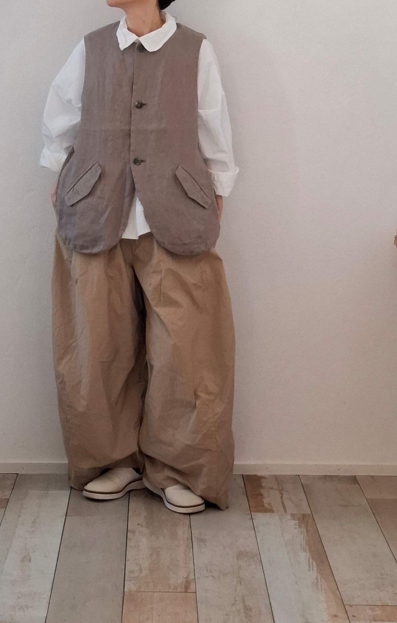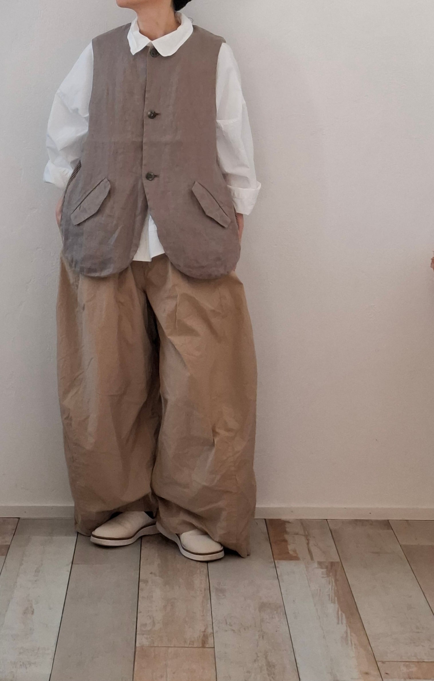 前身頃にはリネンではめずらしいダイアゴナル柄の変形綾織り素材を使用しています。
