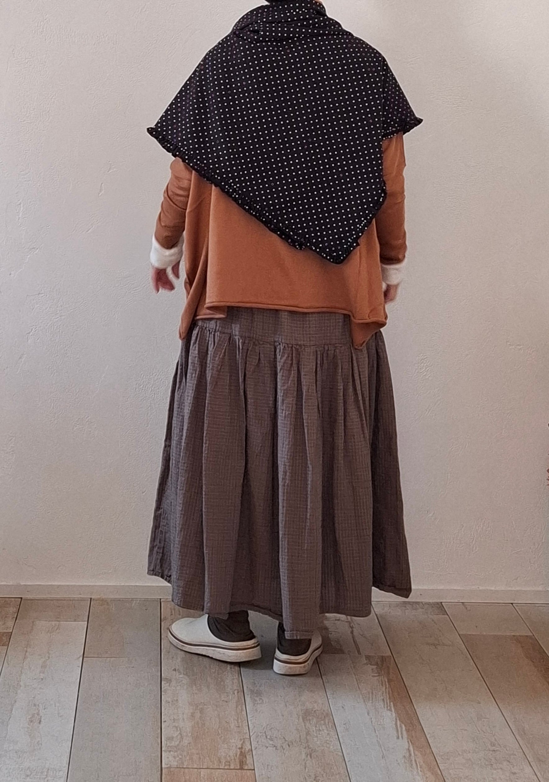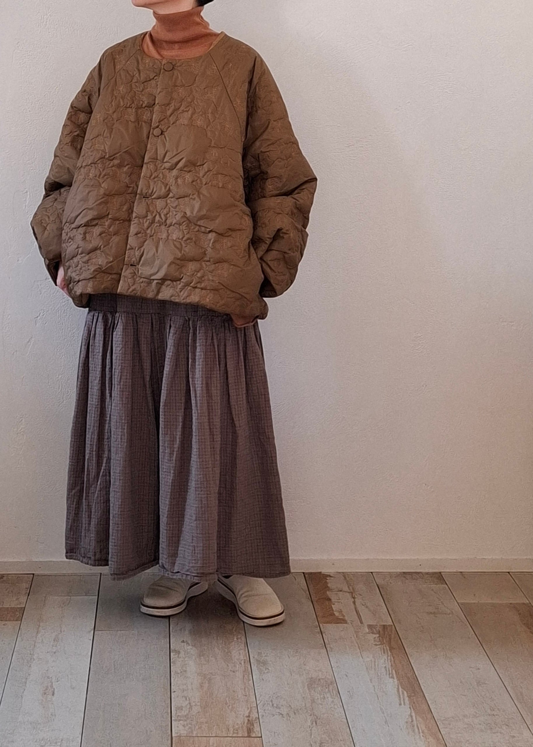 ウエスト下の切り替えにギャザーを寄せ、適度にボリュームを出しています。
