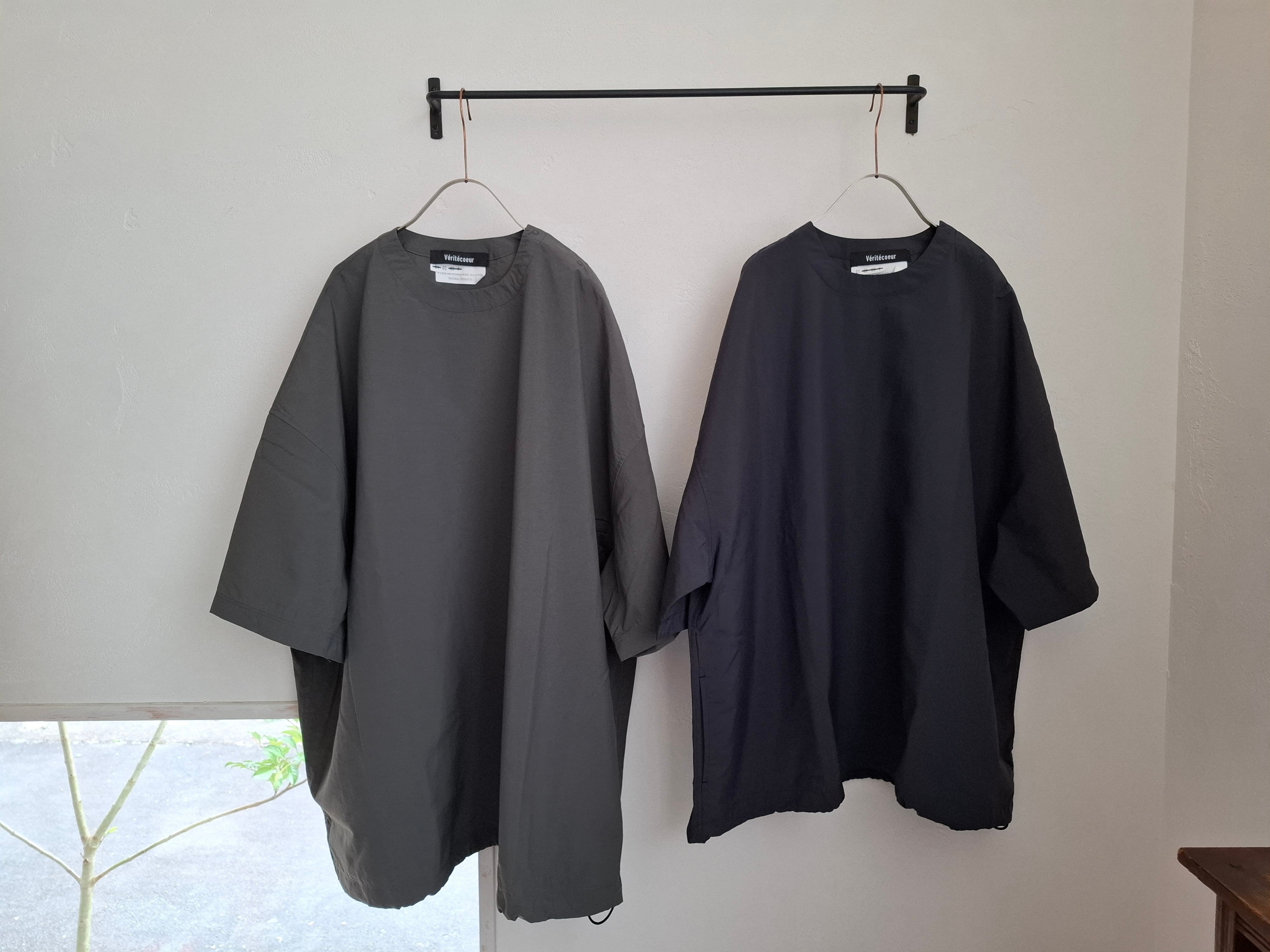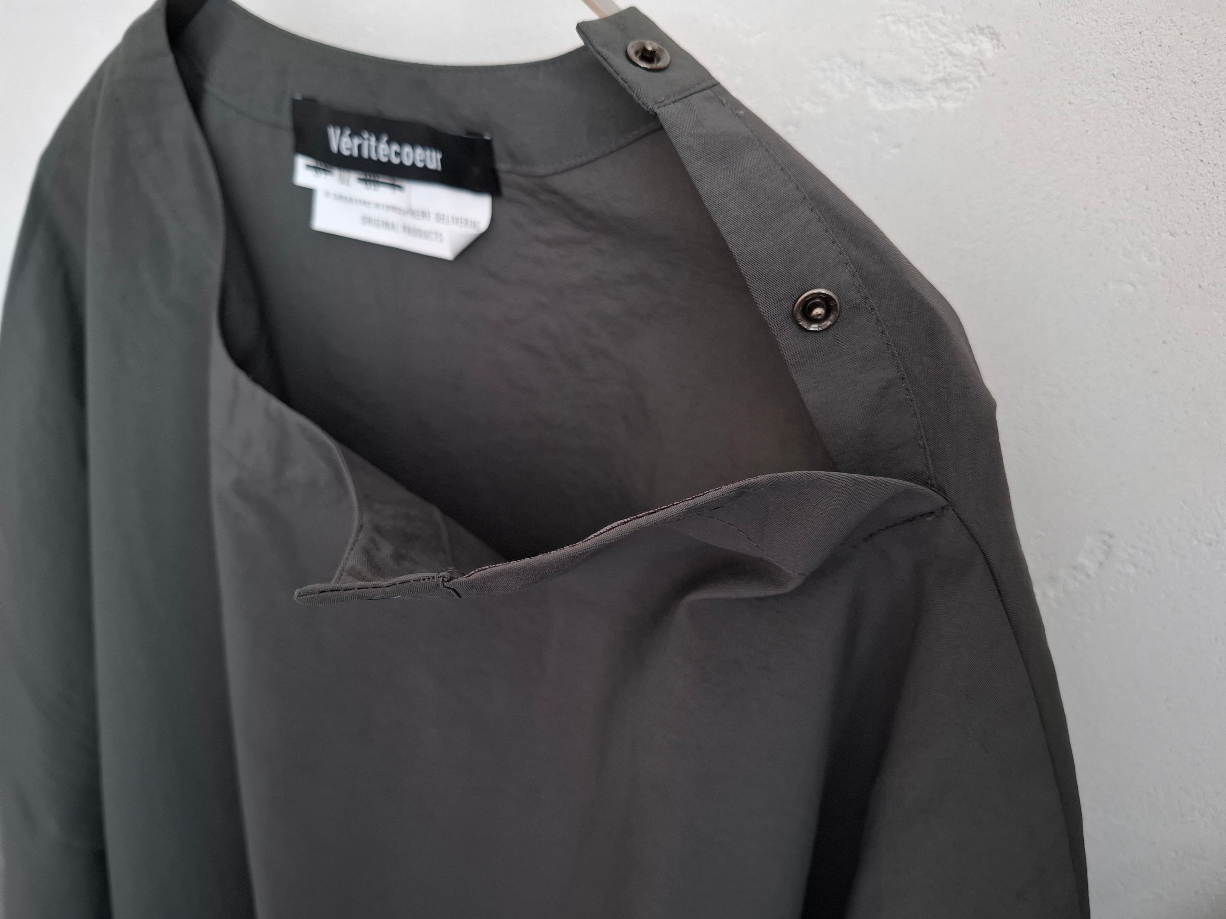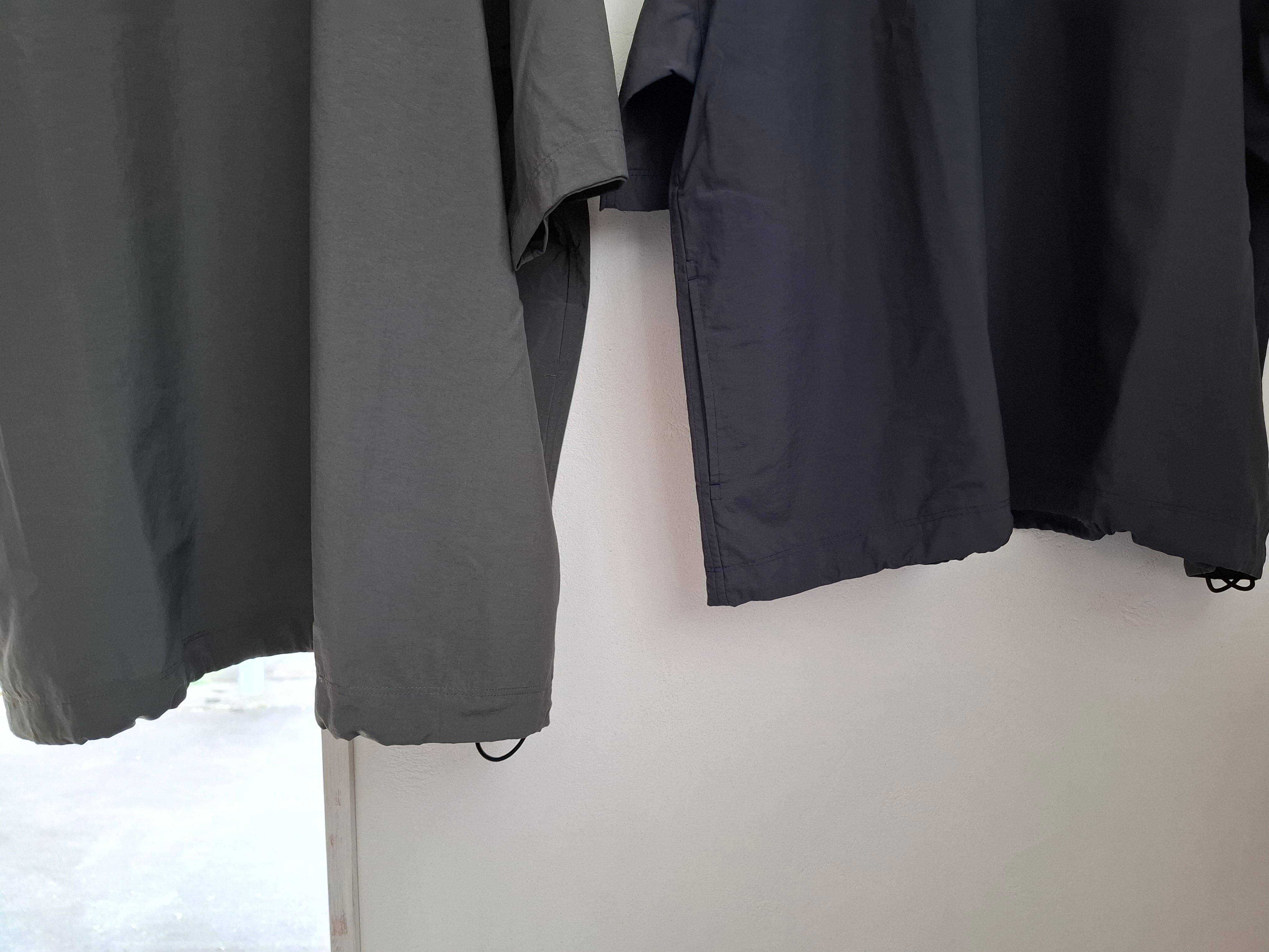 肩で開閉するデザインです。裾にドローストリングが付いており、絞ることでシルエットの変化をたのしめます。ユニセックスの 2 サイズ展開です。