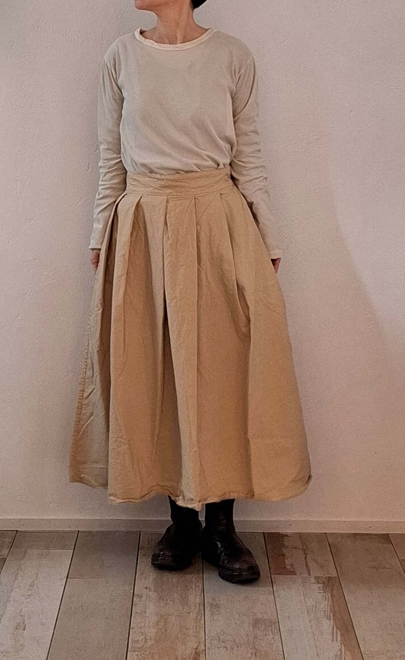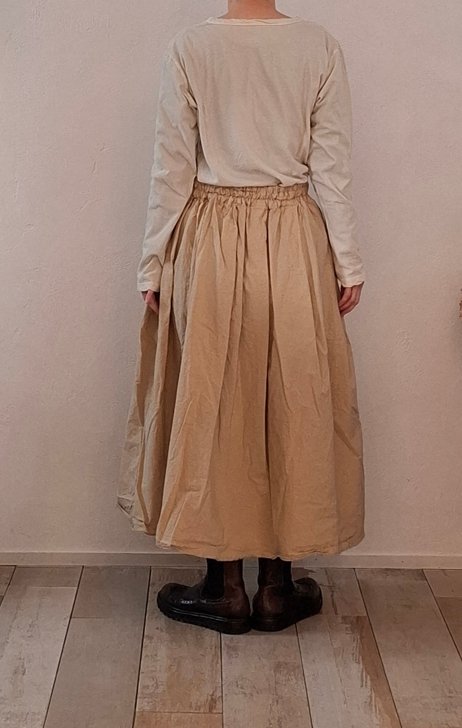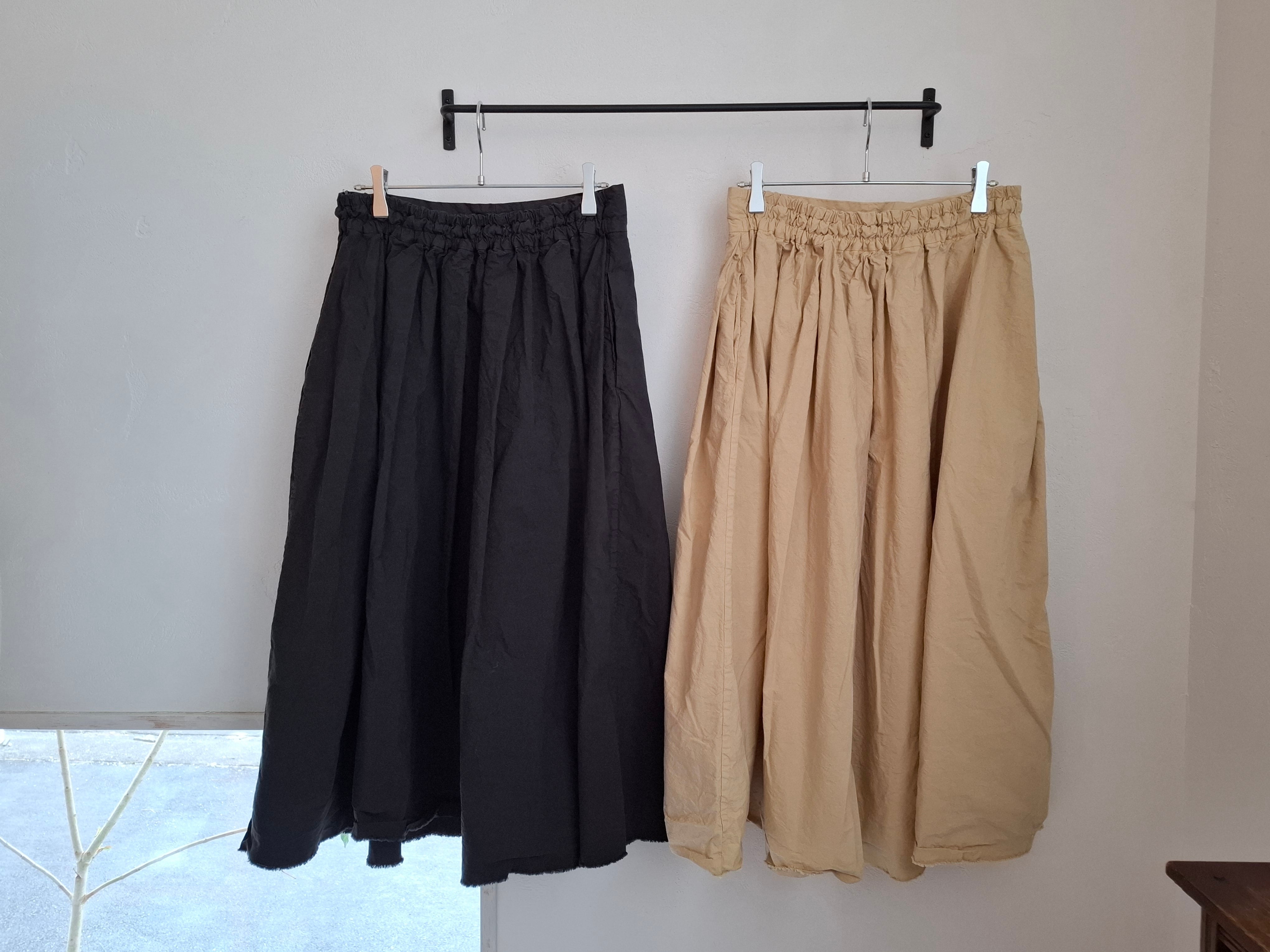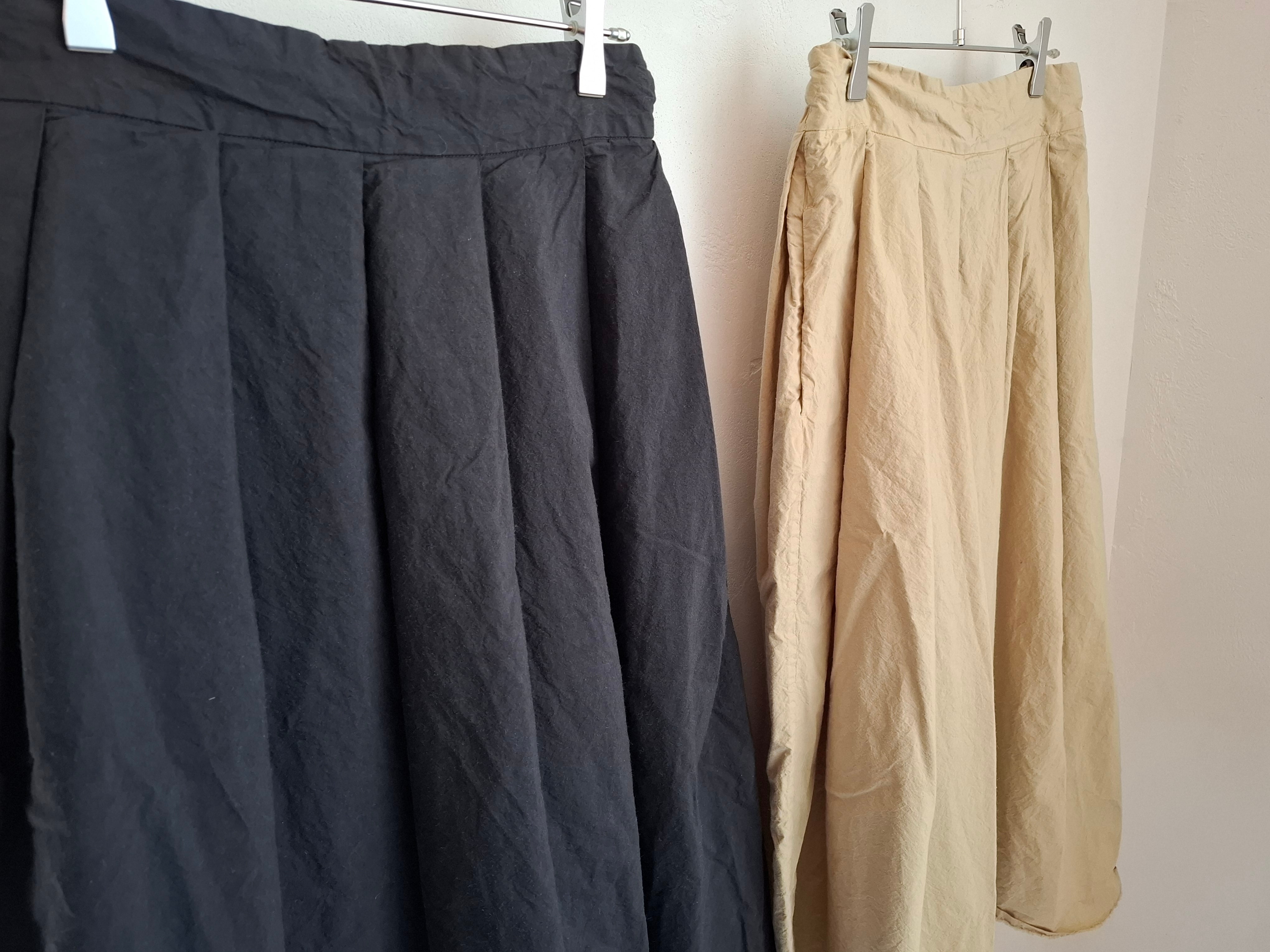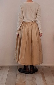 製品染めを施し、洗いざらしの雰囲気に仕上げたタックスカート。