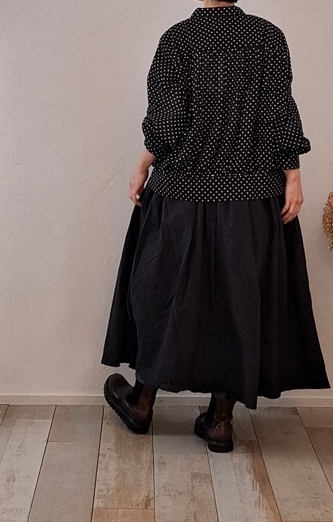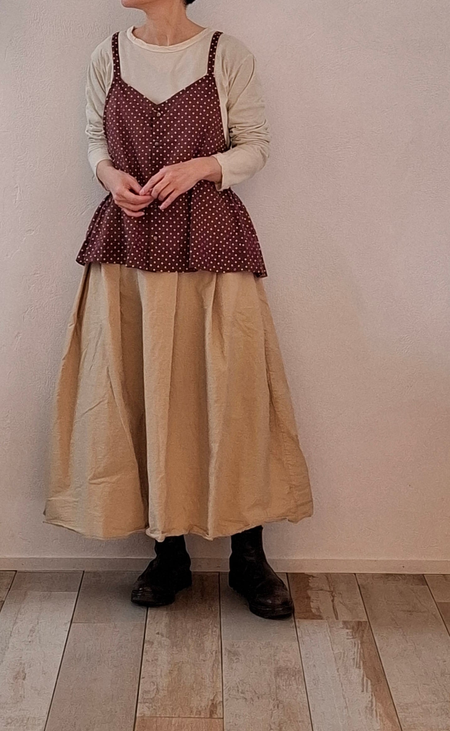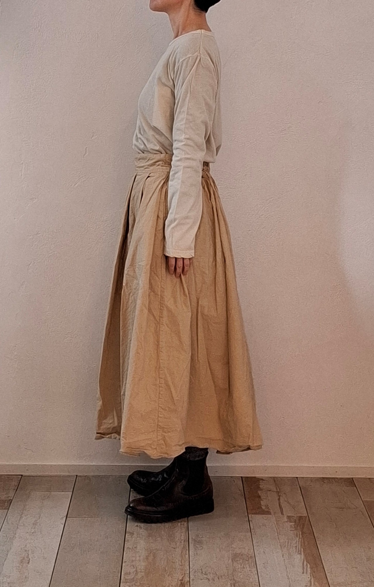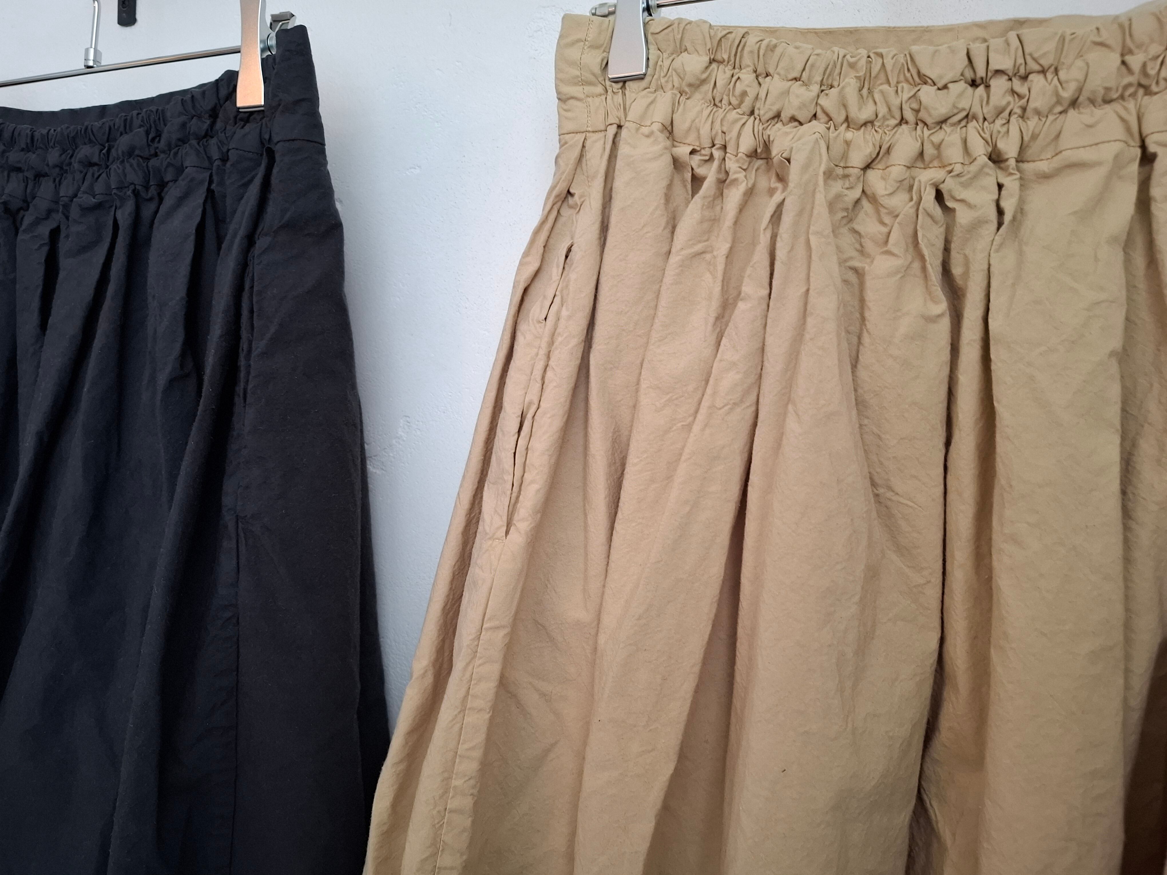 製品染めを施し、洗いざらしの雰囲気に仕上げたタックスカート。