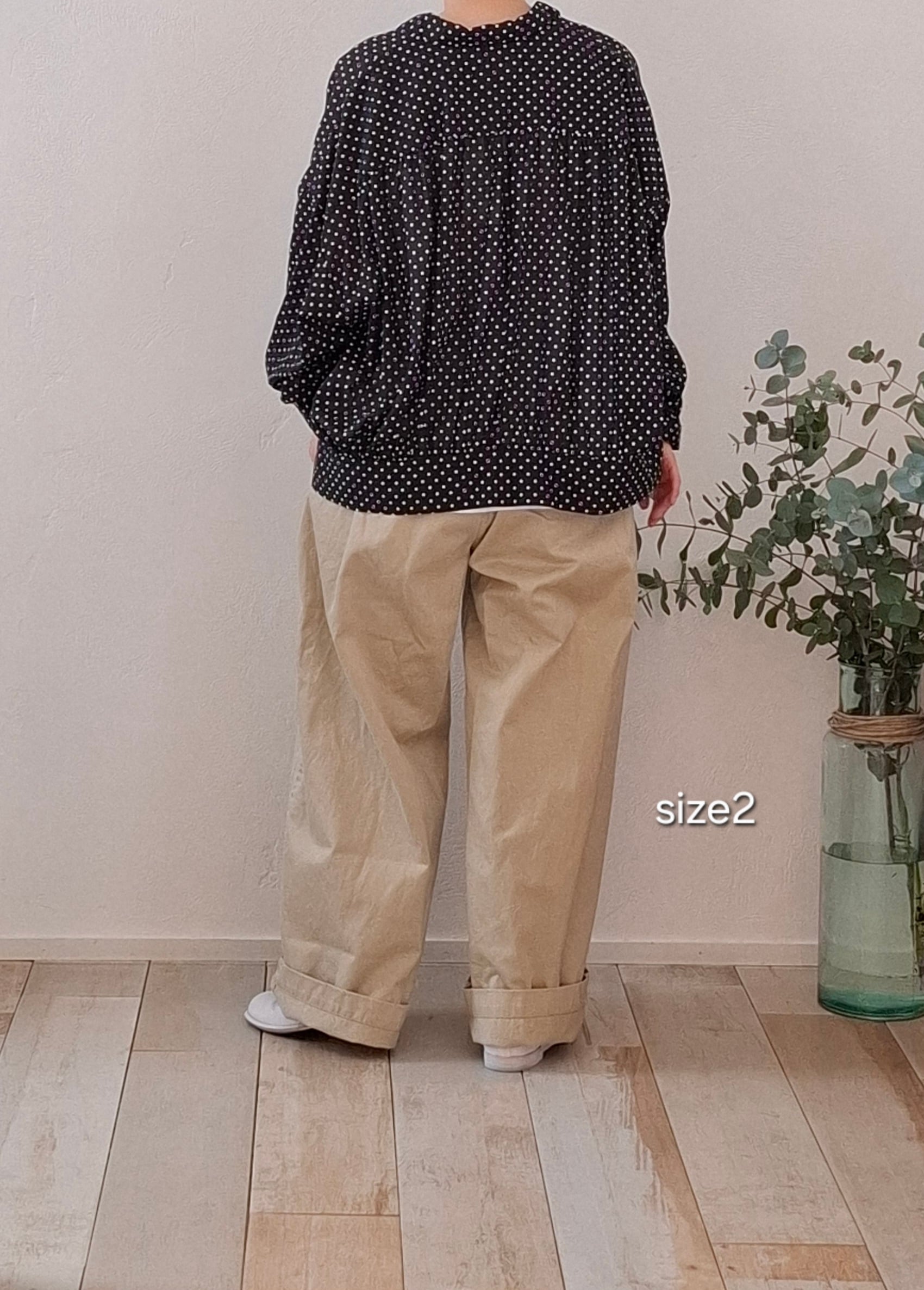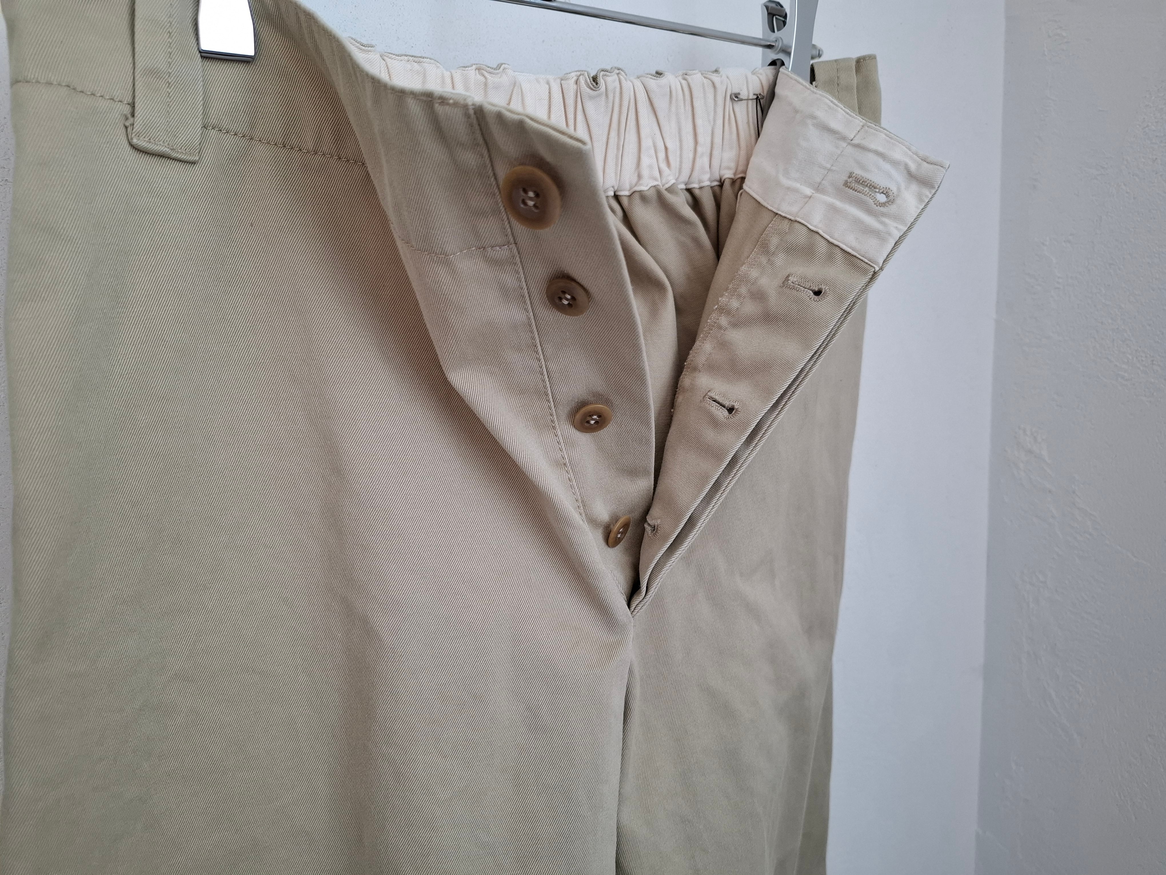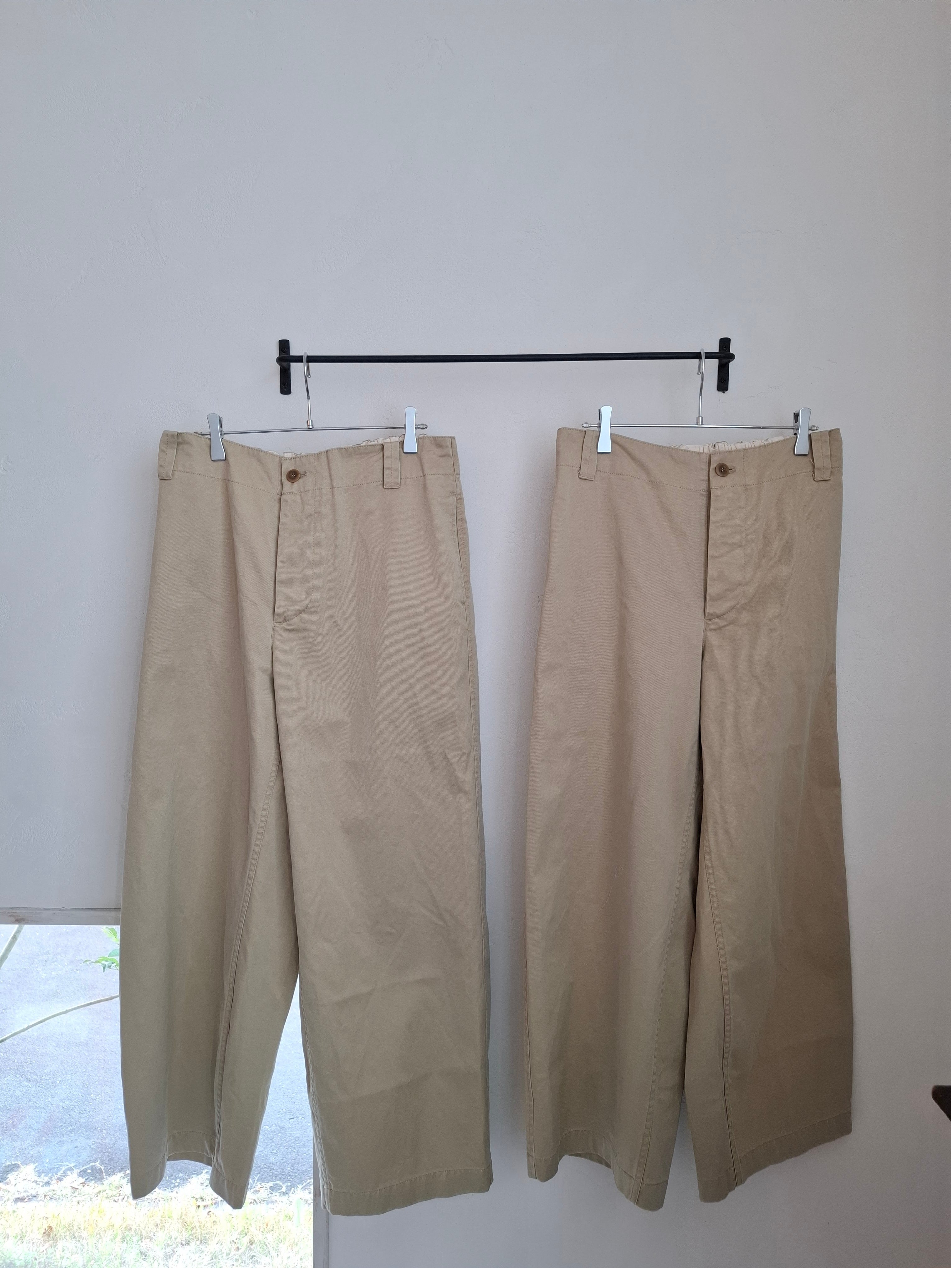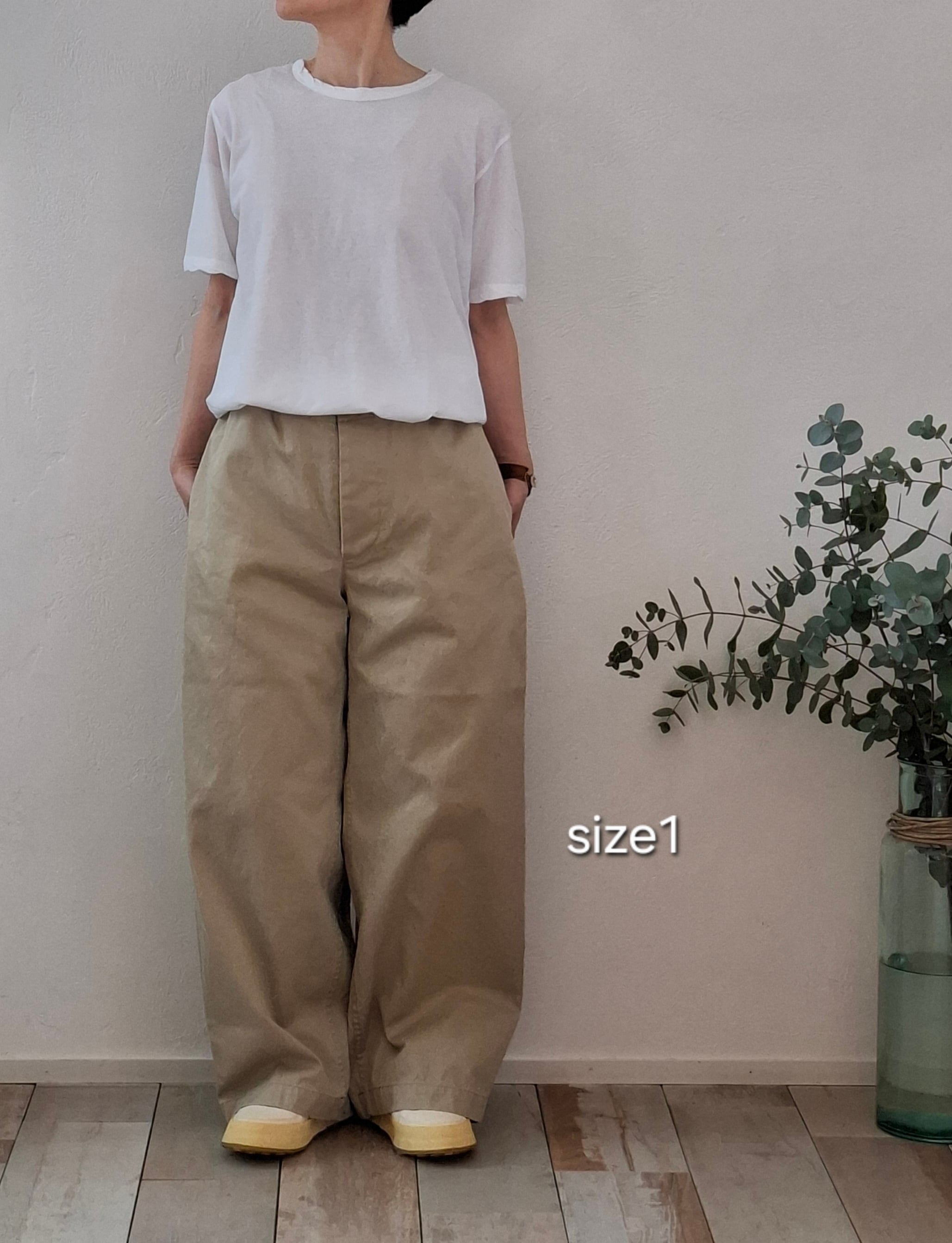 ワタリから裾に掛けて緩やかにカーブしたワイドシルエットが特徴のチノパンツ。