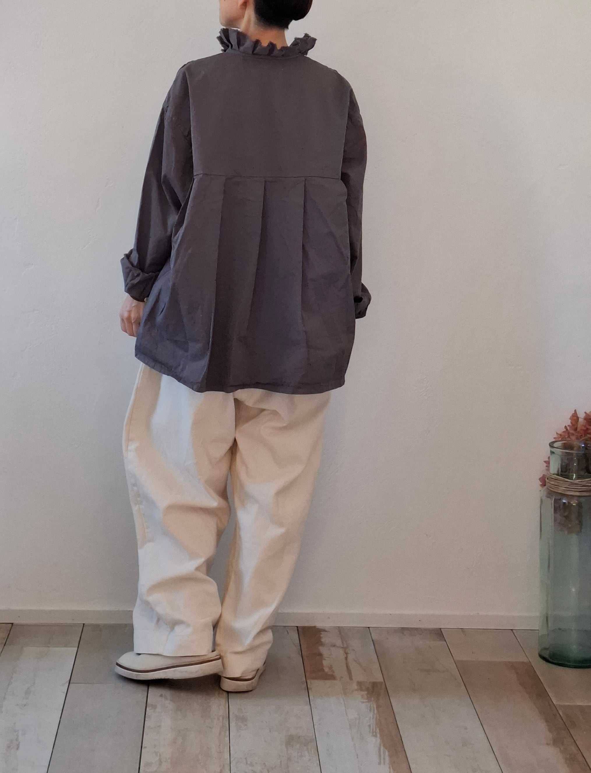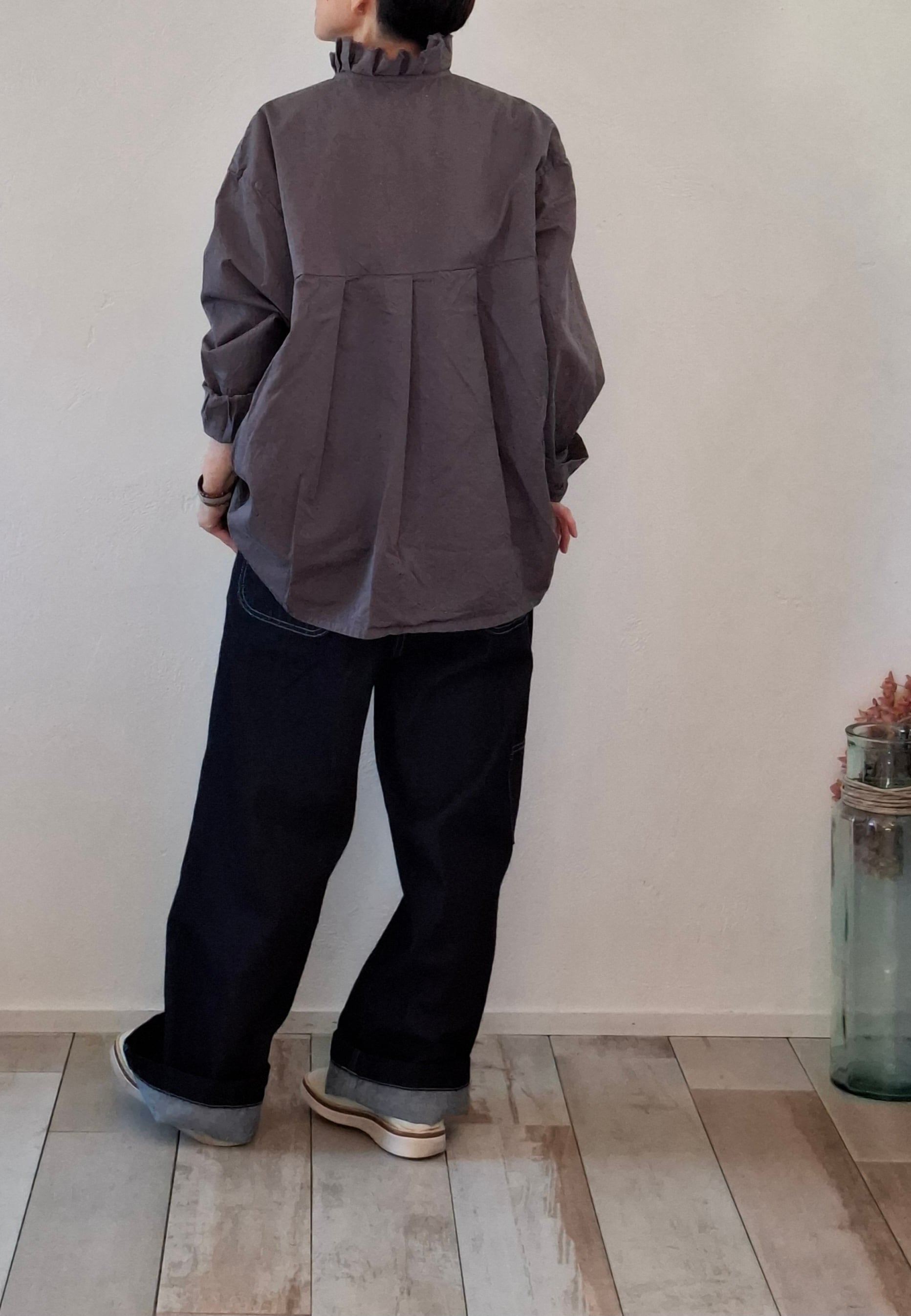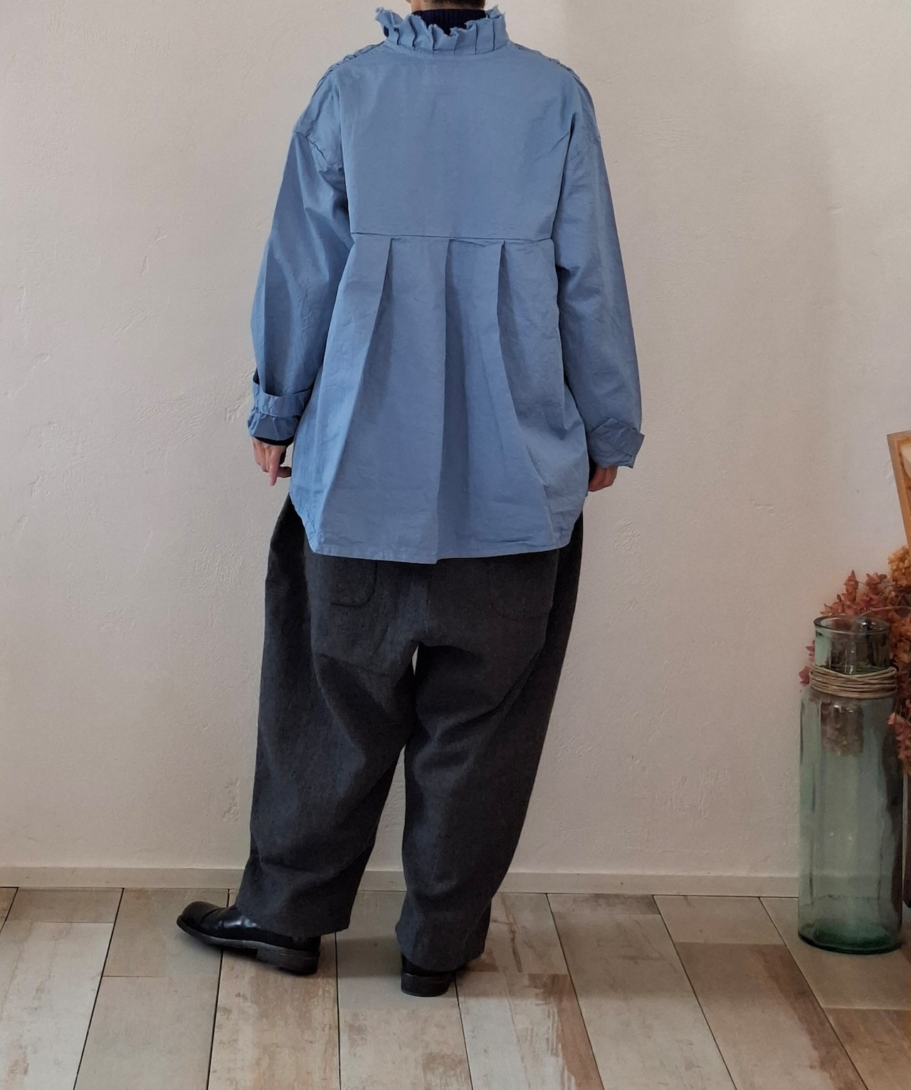 タックフリルを寄せたスタンドカラーが特徴的なブラウス。