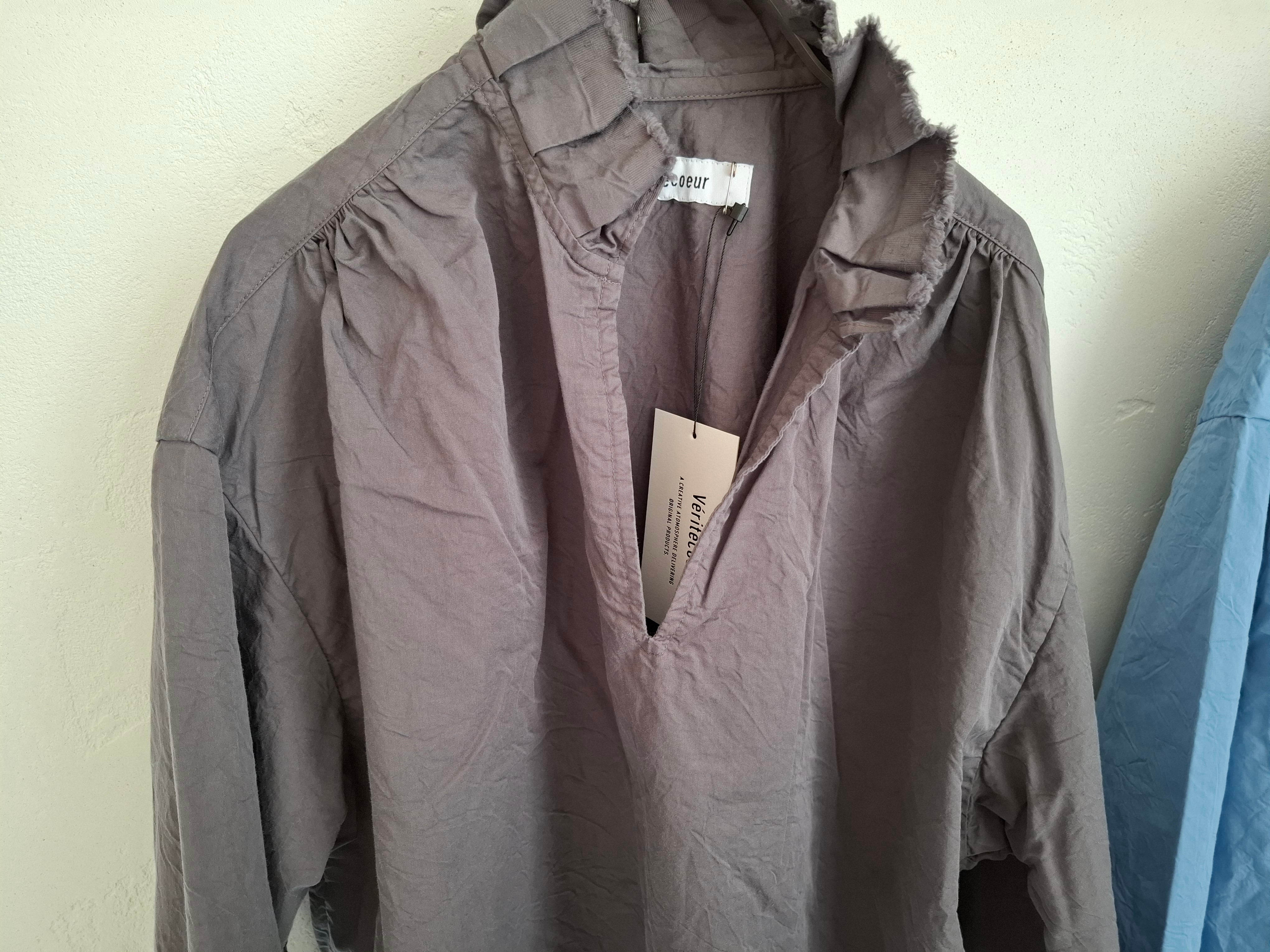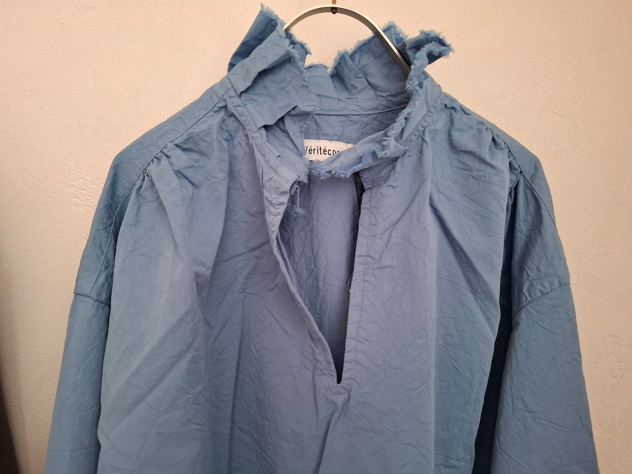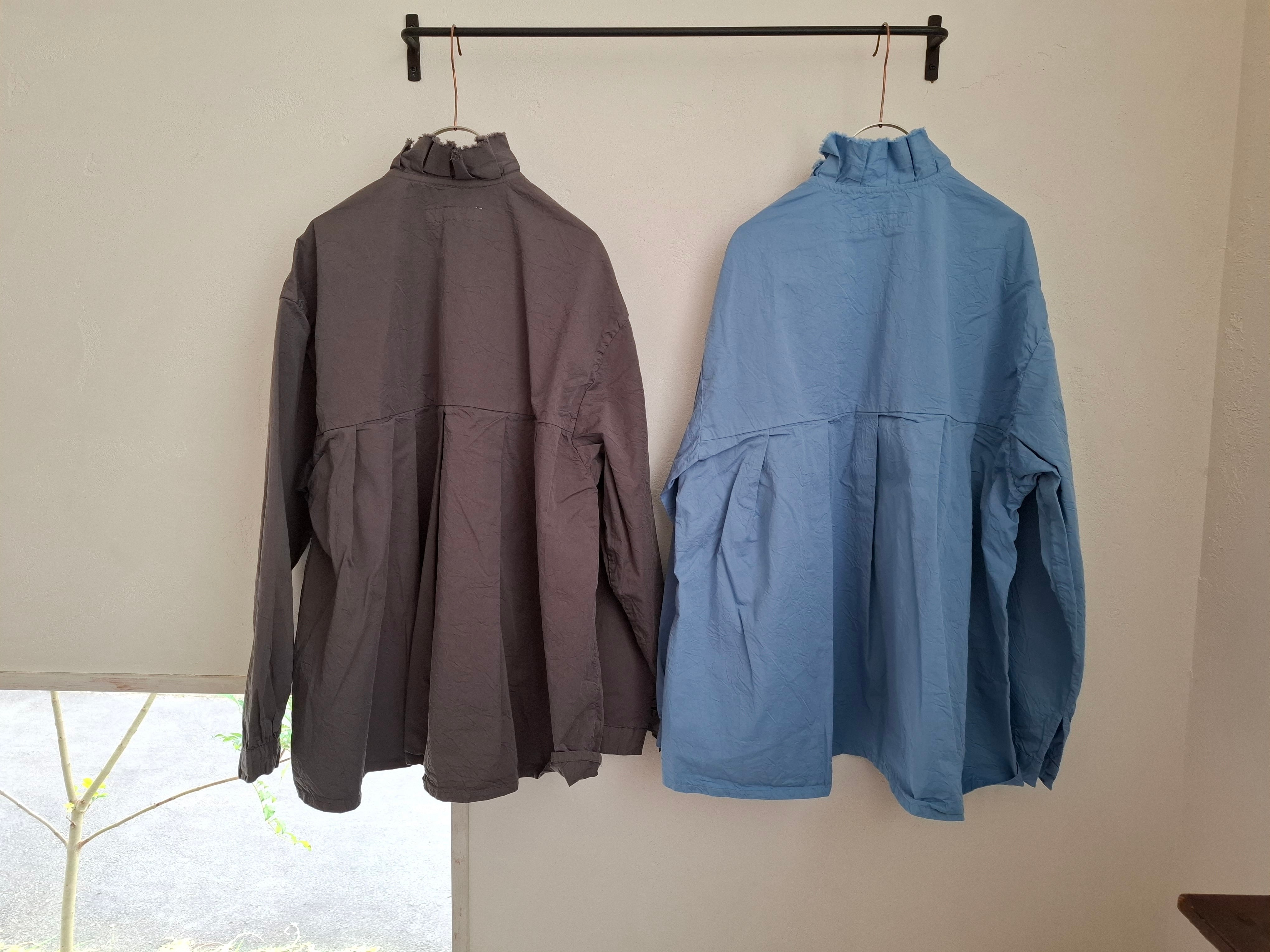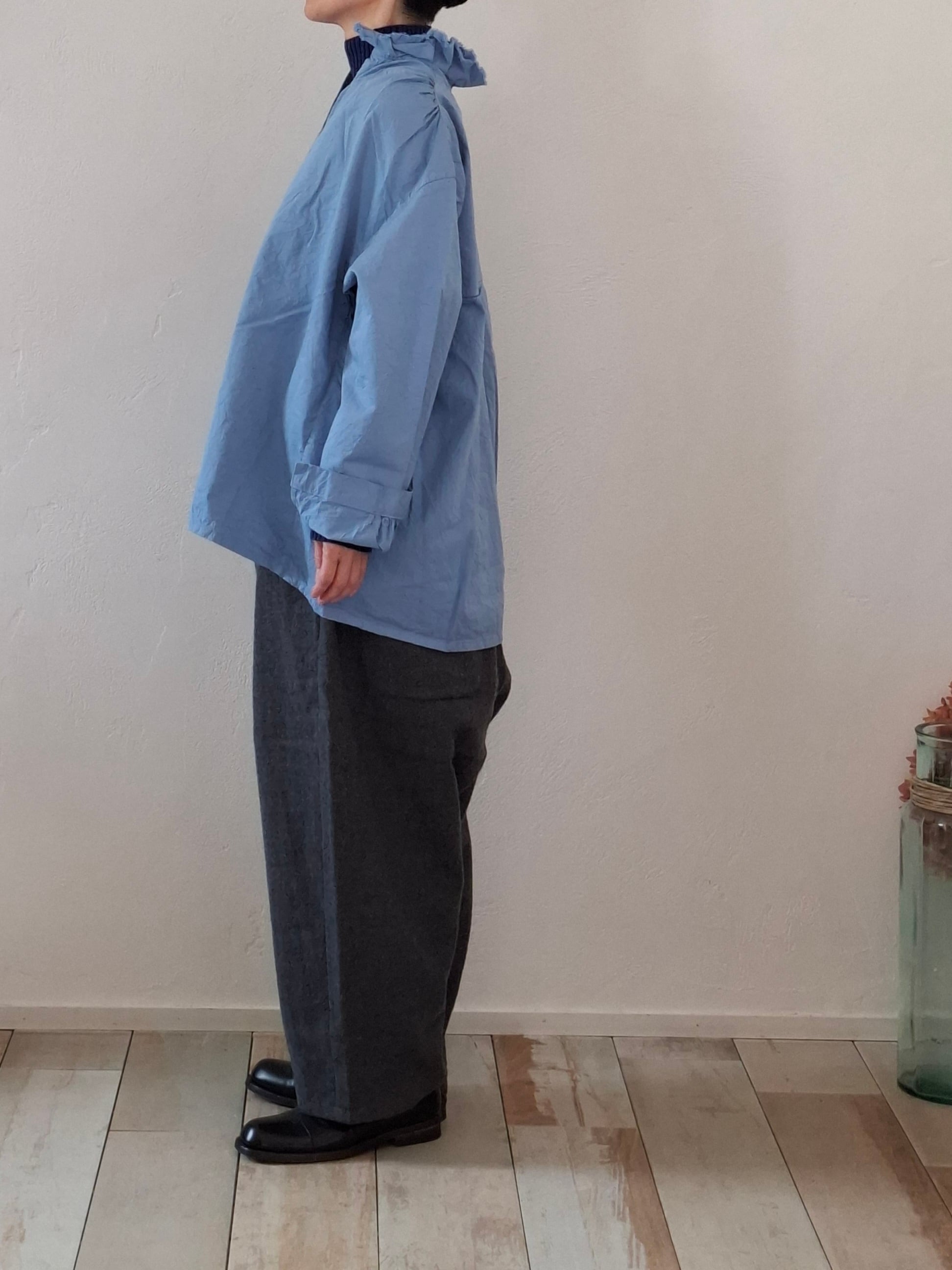 タックフリルを寄せたスタンドカラーが特徴的なブラウス。
